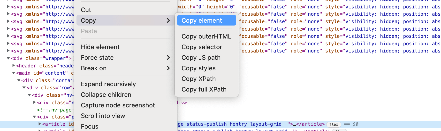 Then, we see that every result found is rendered as a separate <article> element so we just need to take one of them by right-clicking on it, selecting Copy->Copy Element: