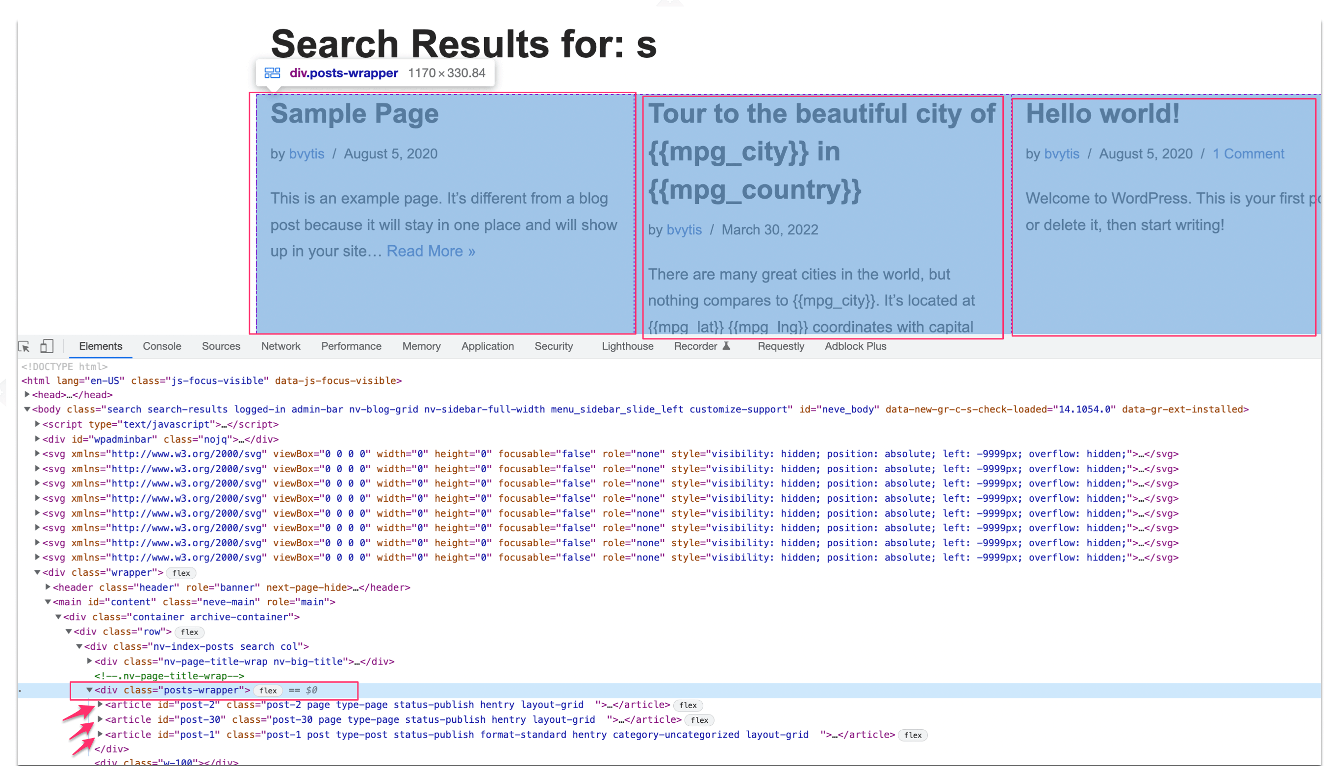 As mentioned we will be using the Neve theme and its search page in this example so here is how the DOM looks for the rendered search page in the Neve theme: