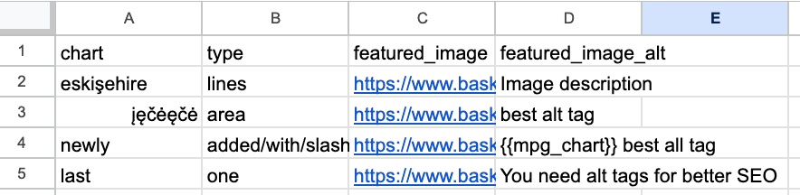 Additionally, you can reference other columns dynamically within the featured_image_alt values. Simply use the dynamic variable format {{mpg_<column name>}} to pull in values from other columns. For example, if you have a column named "location," you can set an alt text value like Beautiful scenery in {{mpg_location}} to dynamically generate context-rich alt text for each image.