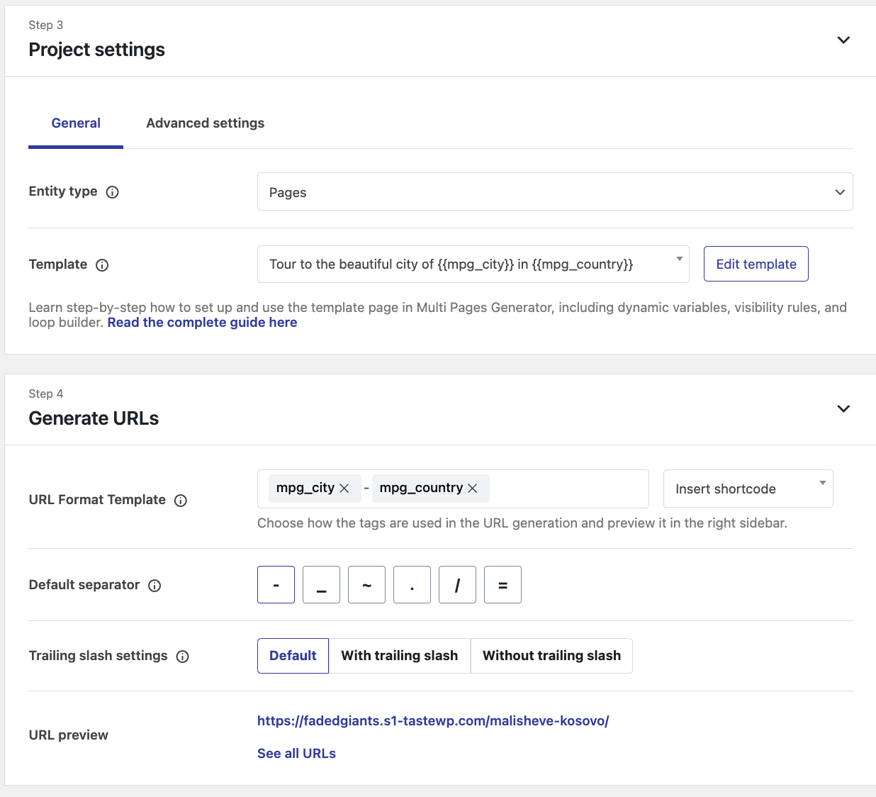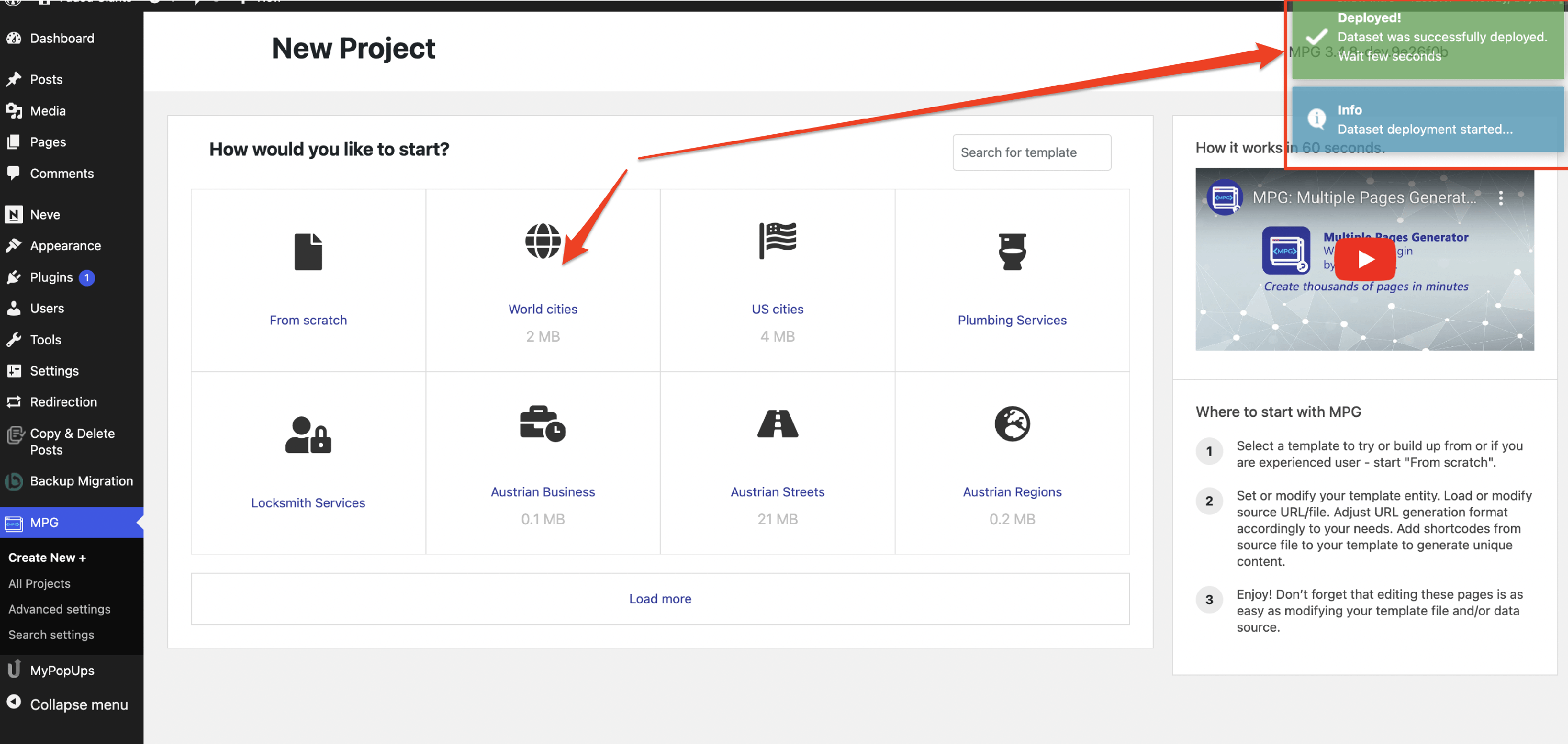 The Dataset Library delivers ready-to-go templates for various domains, such as cities ( World cities and US cities ), services ( Plumbing and Locksmith services ), and other templates requiring a massive generation of pages. Creating a project using a template can be done by following these steps: