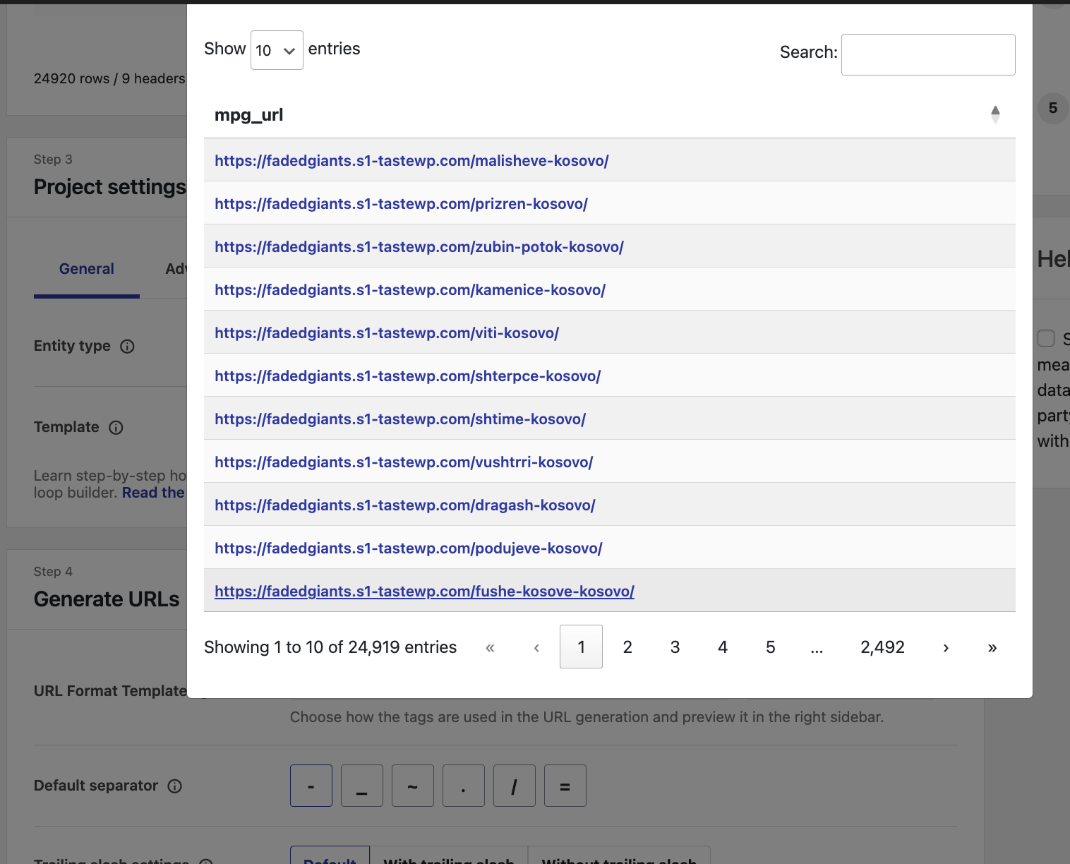 To check the generated URLs, click on the See all URLs button. Once you have done this, a modal with all the URLs will appear:
