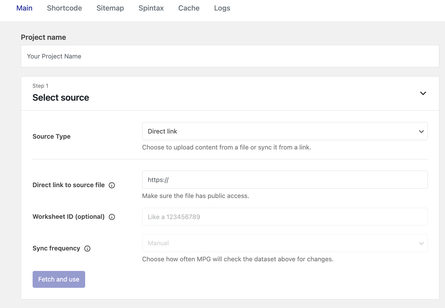 3 Once you have accessed this option, you will be redirected to the page where you have to fill in all the source details.Make sure you follow one of the two available methods of using a file ( direct link or upload a file ), then click on the Fetch and use button.