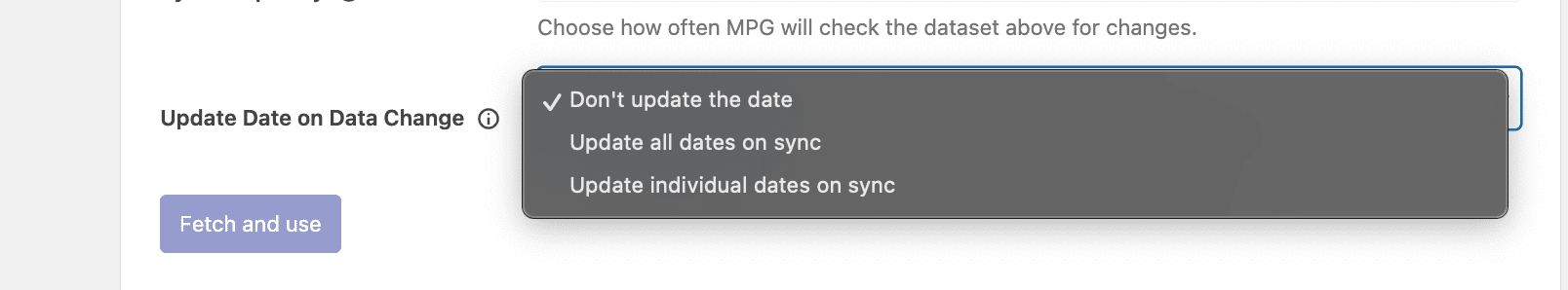 By including amodified_datecolumn in your data source, MPG can set the last modified date for each generated post. This is especially useful when your content changes regularly and you want to reflect the actual modification date.- To make use of this feature, you need to select the option "Update individual dates on sync" from the Update Date on Data Change dropdown (as shown in the image above). This ensures that each page's modification date is updated based on the values in the