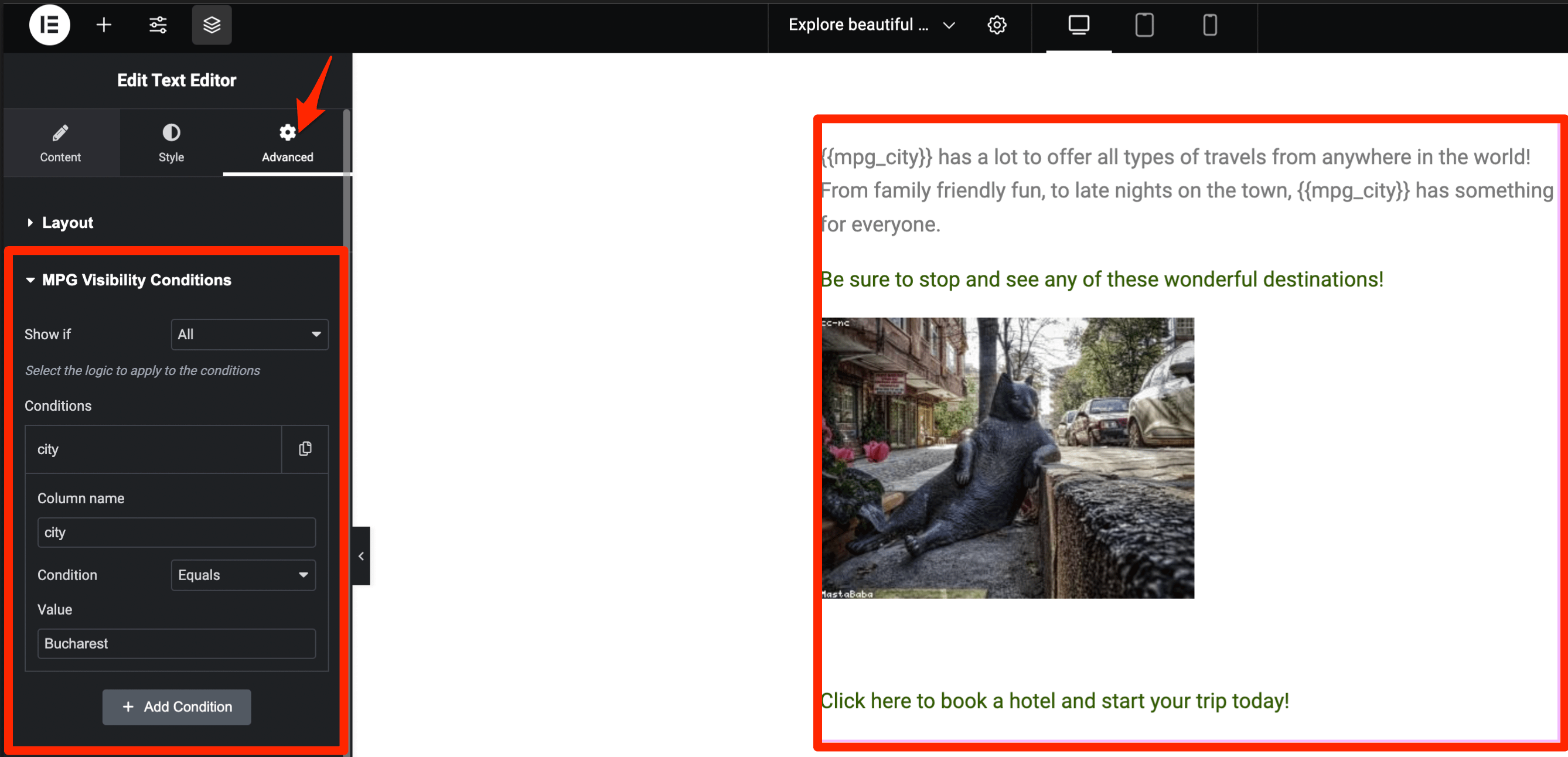 <div>[mpg-if column="country" value="Romania" operator="equals" logic="all"] Content to display if the country is Romania. [/mpg-if] </div><div>[mpg-if where="country=Romania;population>1000"] Content to display if the country is Romania and the population is greater than 1000. [/mpg-if]</div> <br>2. Visibility Conditions in Elementor