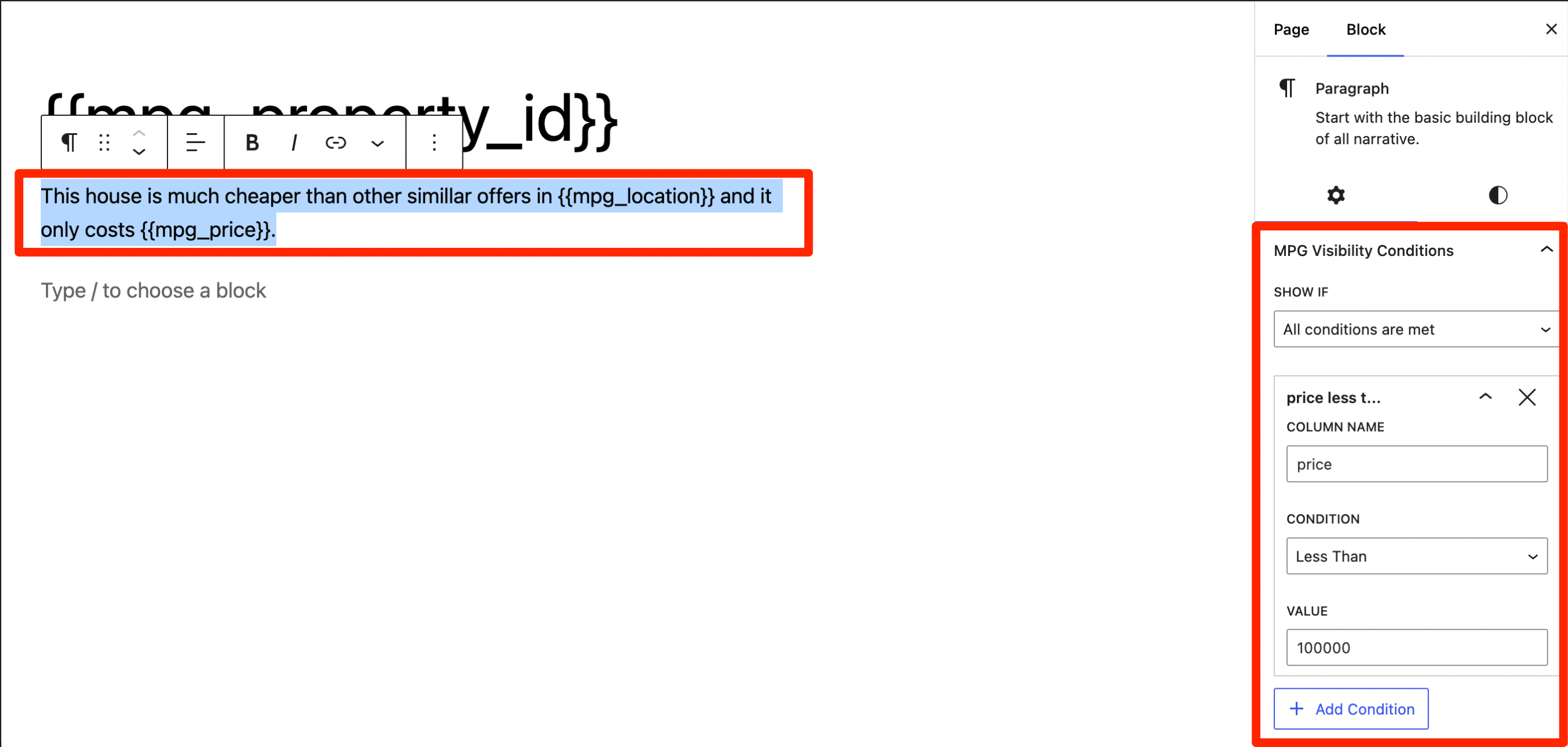 In the WordPress Block Editor, every block also has a section called MPG Visibility Conditions with a built-in condition builder. This section allows you to create conditions similar to those in the Elementor editor.