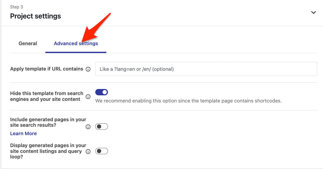 Exclude template from crawlers and site loops - make the template invisible to the site crawlers and within the website. It’s highly recommended to exclude the template page from indexing by search engines as it contains shortcodes. All other generated pages will remain visible.