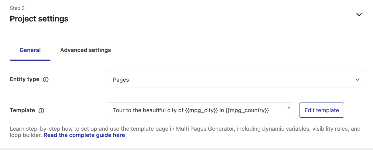 Template - depending on the entity type, here will be displayed in the dropdown all those pages / posts, from which you can select one that will become a template for the ones generated now. MPG will replace any shortcodes accessing the site through the generated URL to your source file.