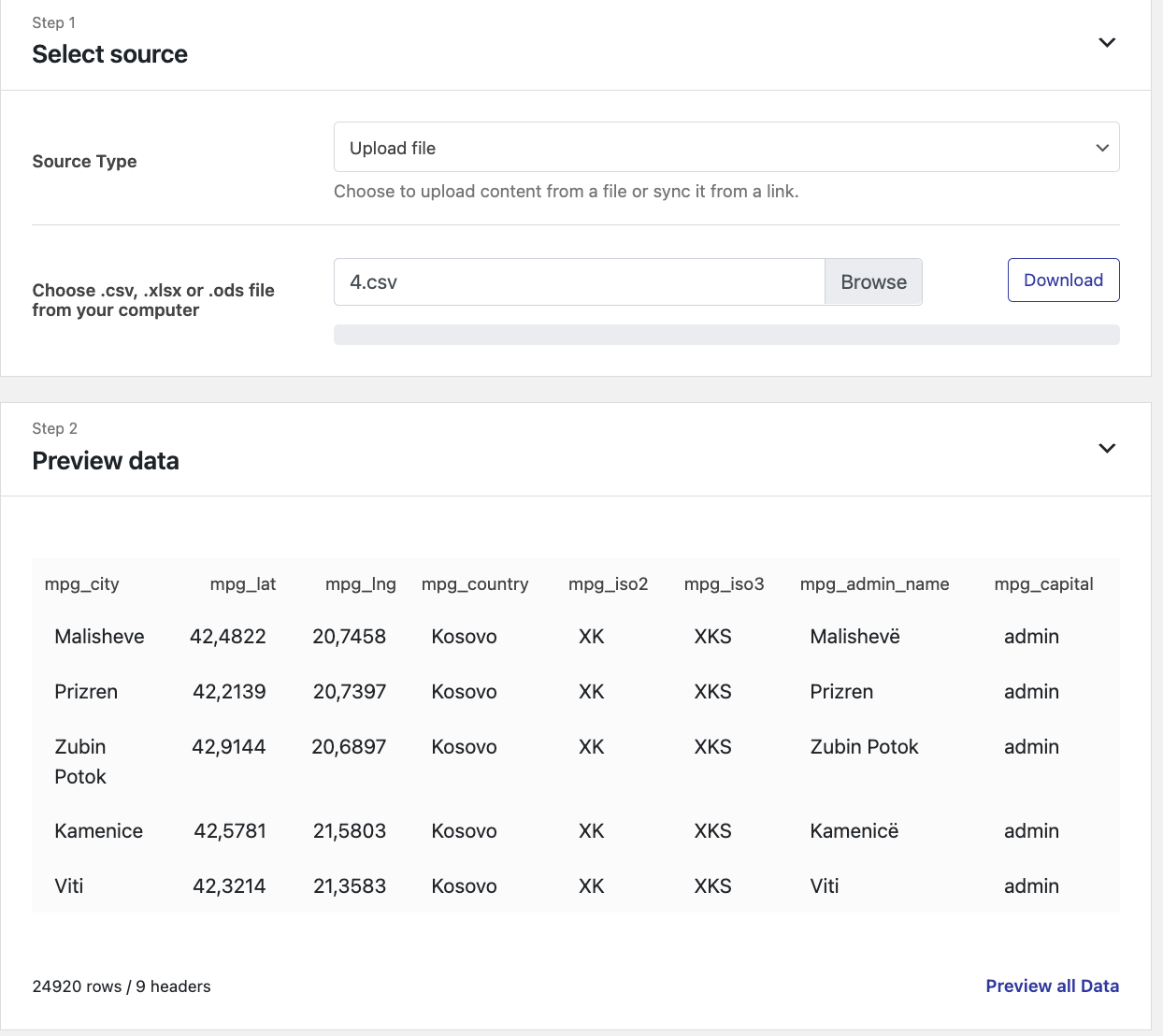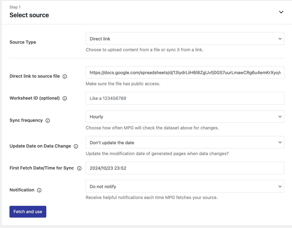 - Direct link to source file - insert the link of the file ( Google Sheets or CSV ) that will generate data for the MPG pages. It needs to have public access.