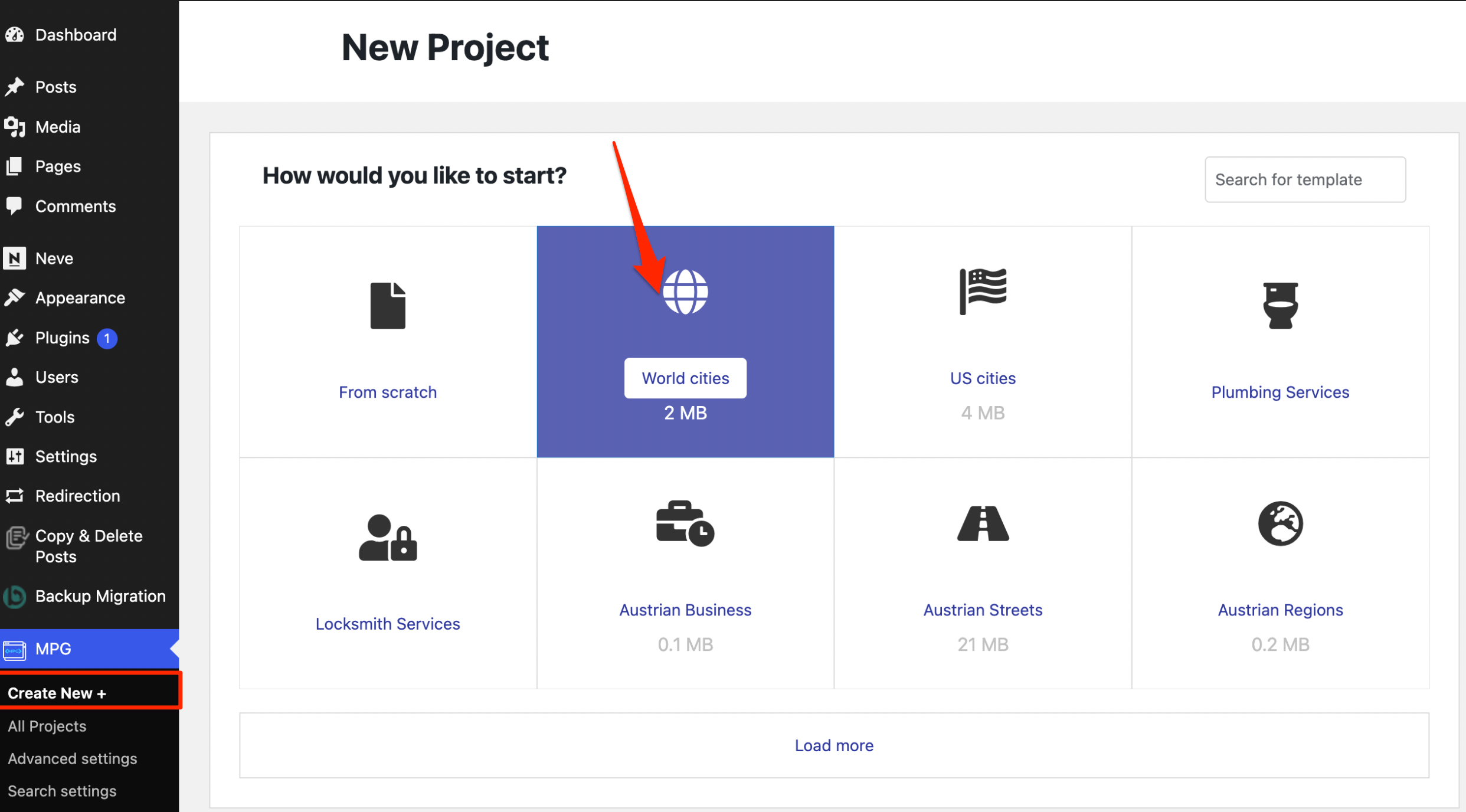 The Dataset Library delivers ready-to-go templates for various domains, such as cities ( World cities and US cities ), services ( Plumbing and Locksmith services ), and other templates requiring a massive generation of pages. Creating a project using a template can be done by following these steps: