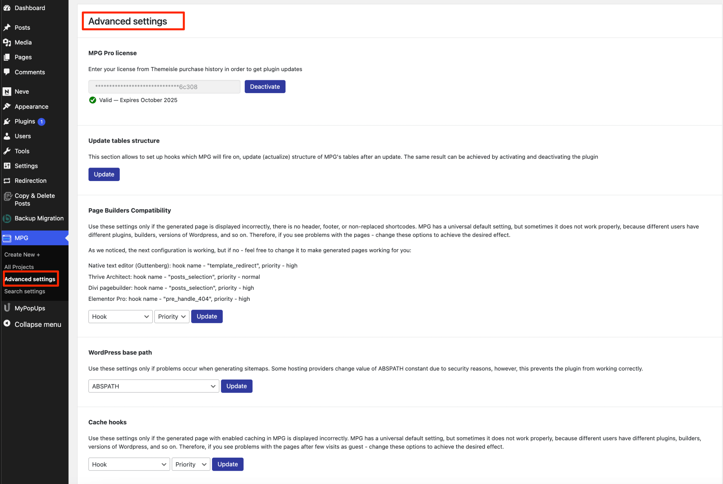 Cache hooks - installing different plugins, builders, or different versions of WordPress may influence the MPG settings, and from this section, you can change the options to solve the issues.