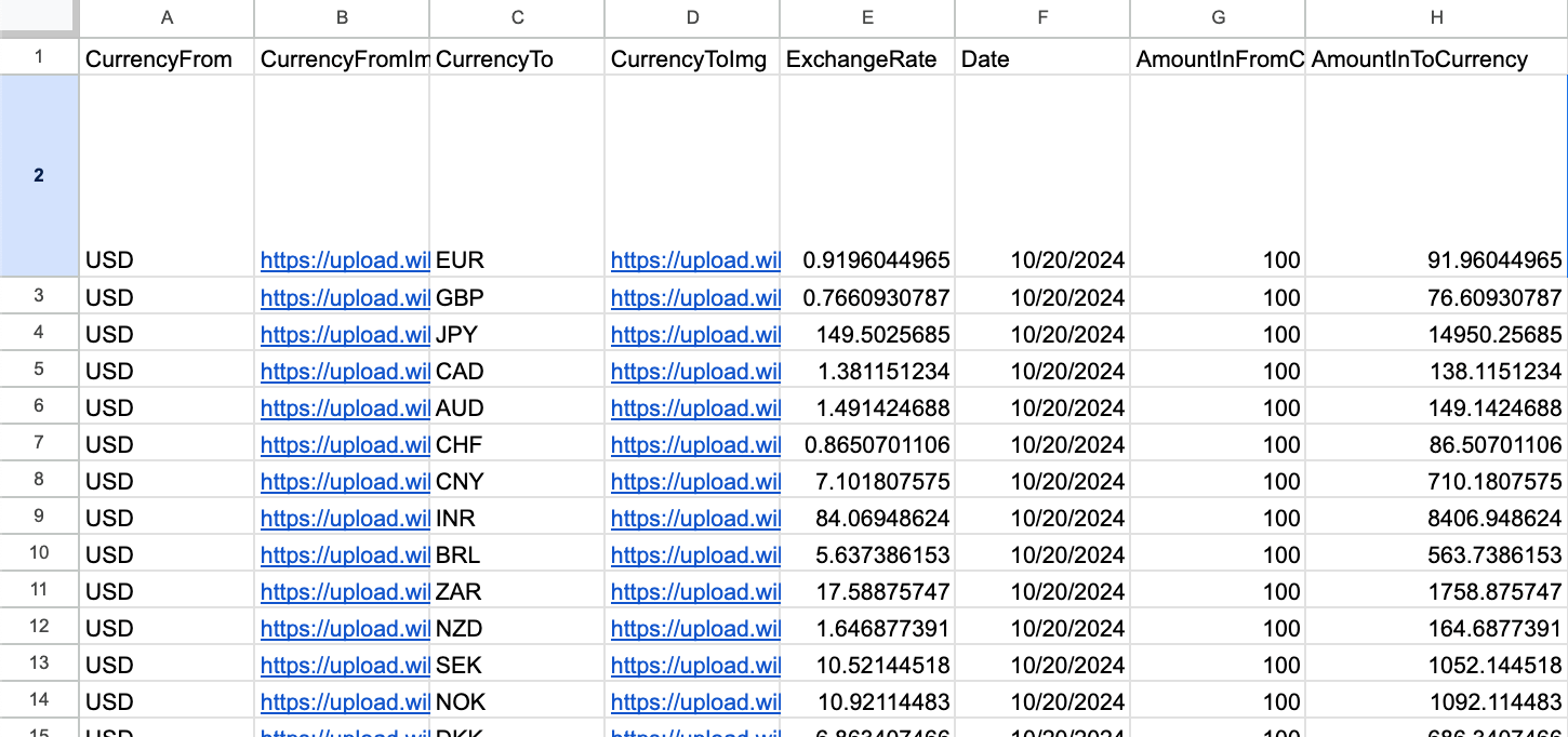 You should have a Google Sheet with columns like "CurrencyFrom" and "CurrencyTo" containing the currencies you want to compare. Here is the spreadsheet that we're using for this example: Link - Create a new column (e.g., "Description") where you want to generate the AI output.