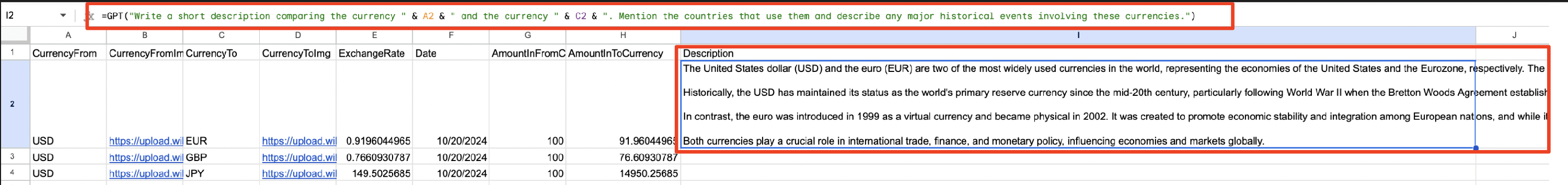 <code>=GPT("Write a short description comparing the currency " & A2 & " and the currency " & C2 & ". Mention the countries that use them and describe any major historical events involving these currencies.")- Drag the formula down to automatically generate descriptions for the entire dataset.