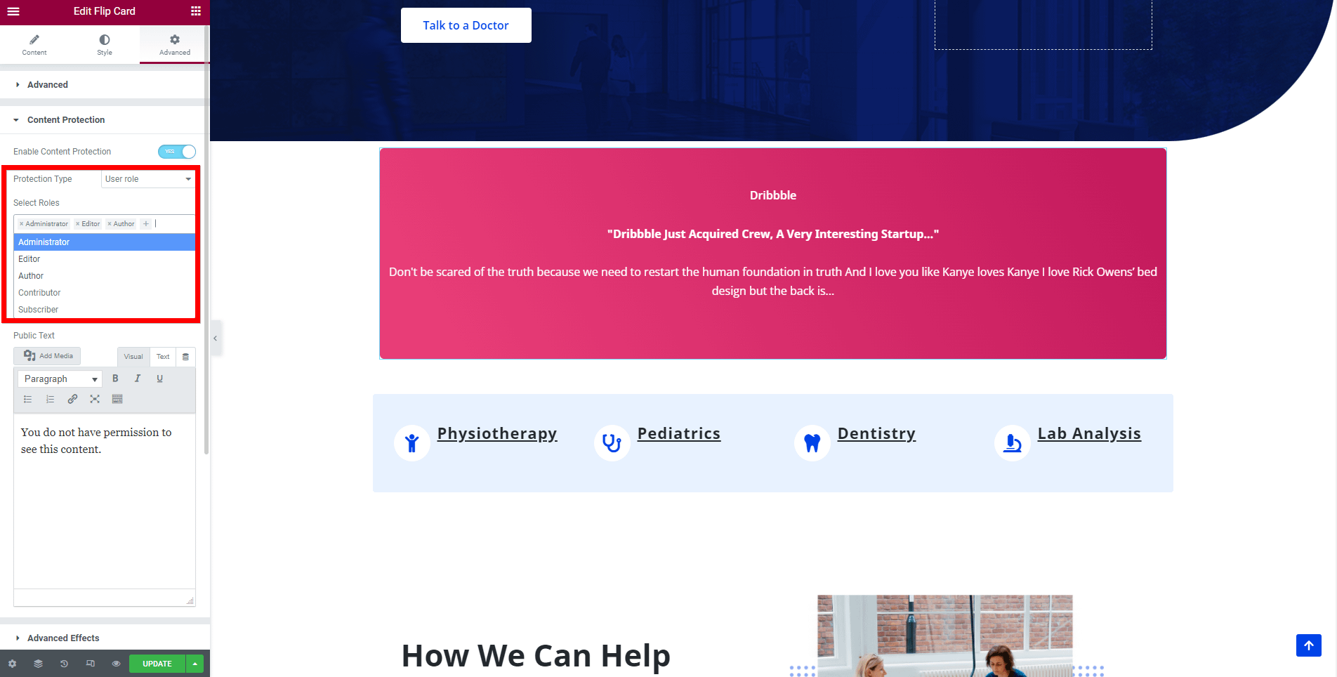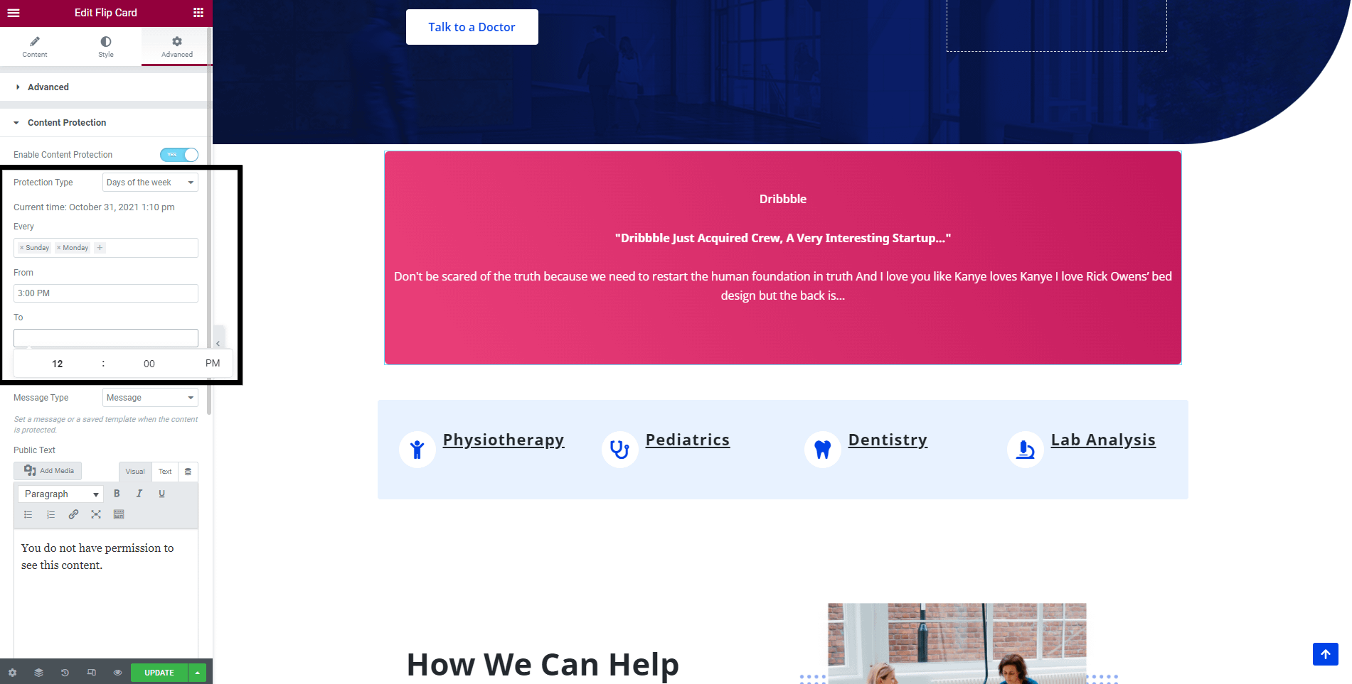 The Content Protection option gives you the opportunity to restrict any Elementor content from certain people based on time, user rules, password, logged-in / not logged-in user, and dates of the week.