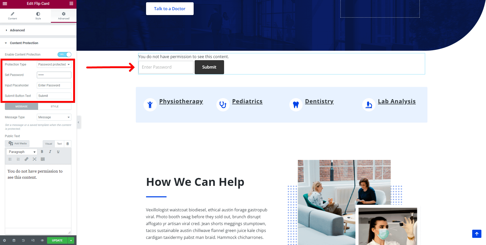 Password Protected - you will have to set a password that will be required to insert to view the content. Besides that, you can change the Input Placeholder and Submit Button Text.