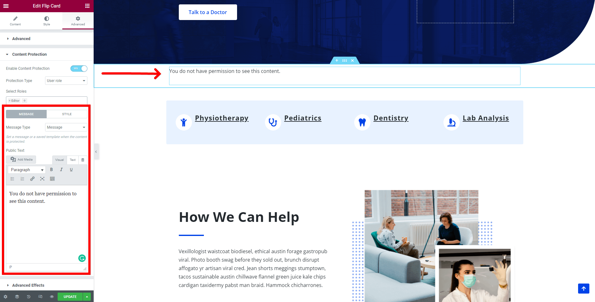 📩 Message settings - configure the message that will be displayed when the content is protected and navigate into the Style tab of this option, to customize the message appearance.