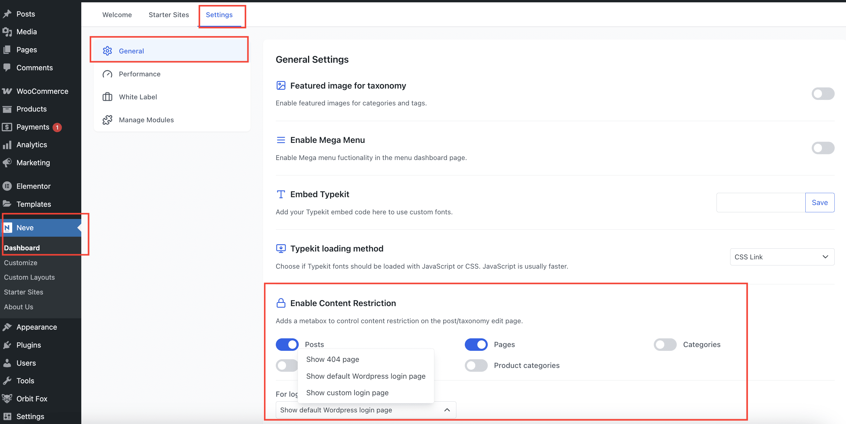 To use the module, navigate to Neve > Dashboard > Settings > General > Enable Content Restriction and enable the module for the post types of your choice ( Posts, Pages etc ). After that, select what will be shown when the restriction conditions are not met: Show 404 page, Show default WP login page or Show custom login page.