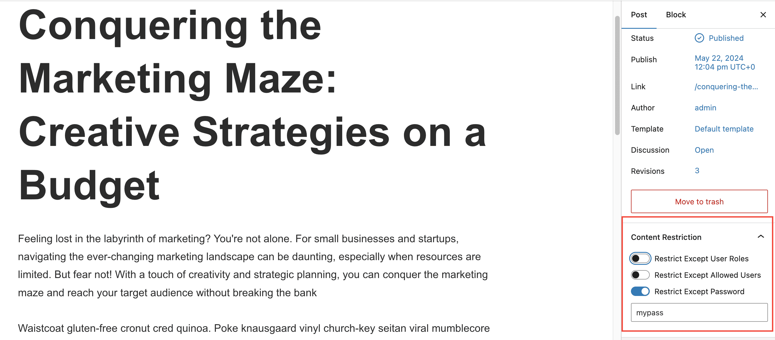 Now, that content restriction is enabled for Posts, navigate to the post that needs to have its content restricted and choose its specific restrictions.
