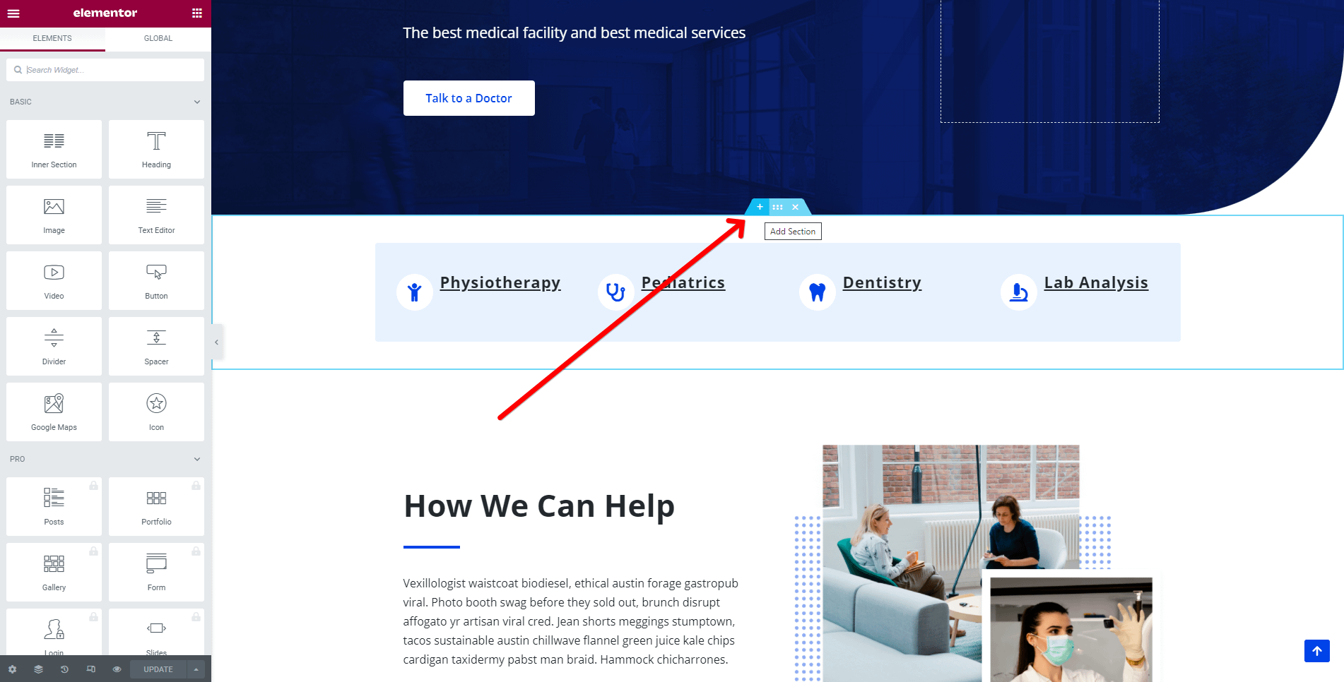 1 Once the Elementor Editor has been opened, click on the ➕ button to add a new section on the page.