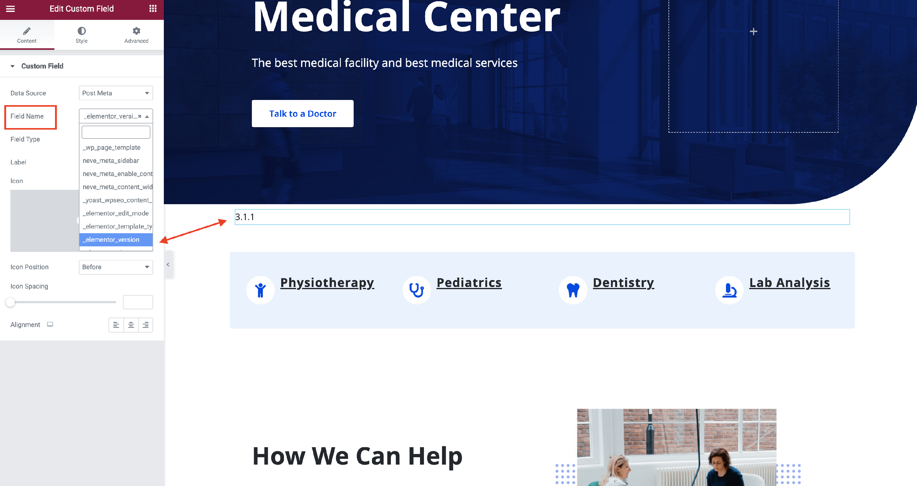 - Field Name - you can select the desired field created earlier and this will dynamically display its value on the page.