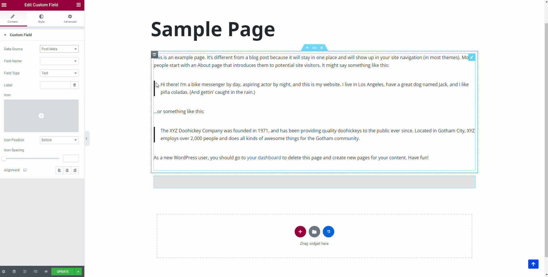 3Drag and drop the Custom Field widget into the selected area.