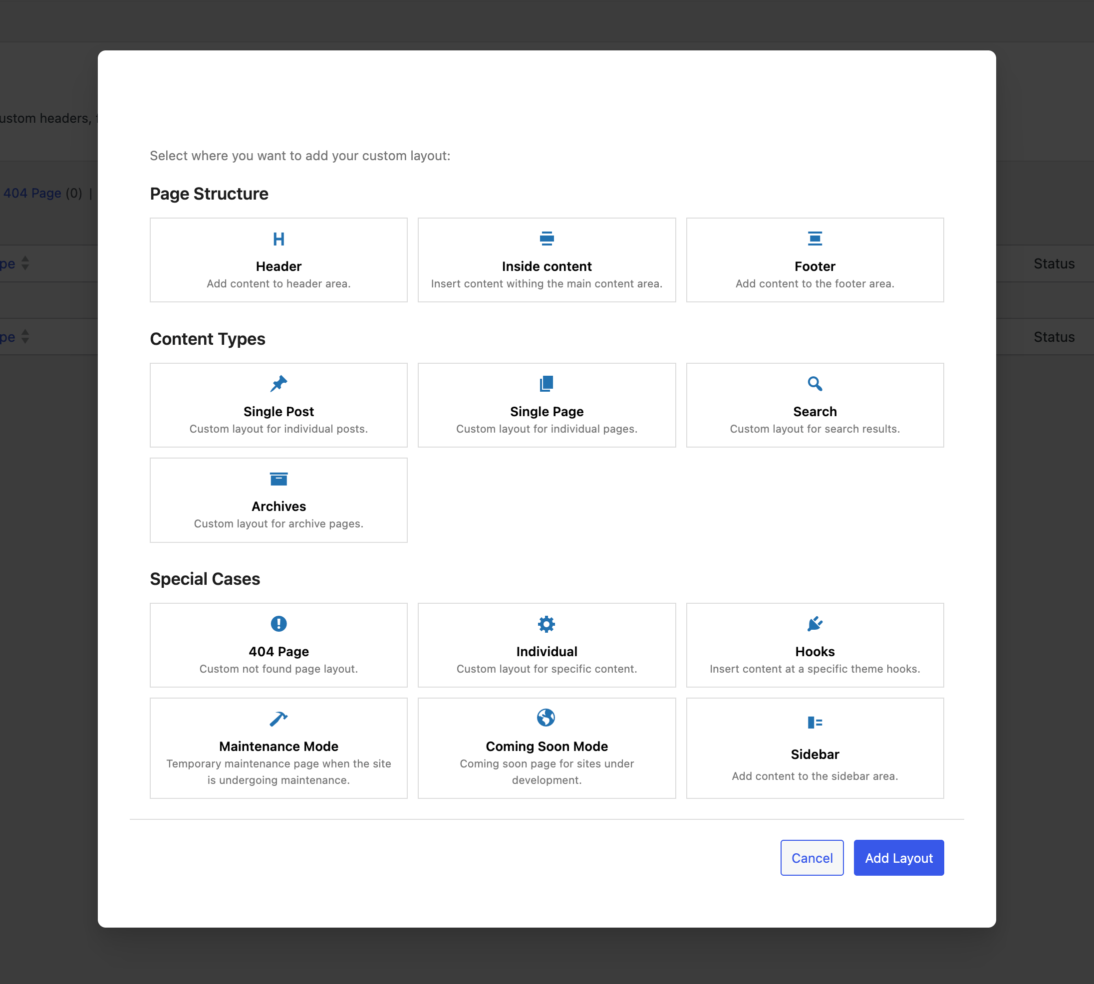 Custom Layouts can be inserted in specific places (hooks) of the theme. To have a visual representation of where each hook is located, just click on the Show Hooks link in the top admin bar, when visiting your site.