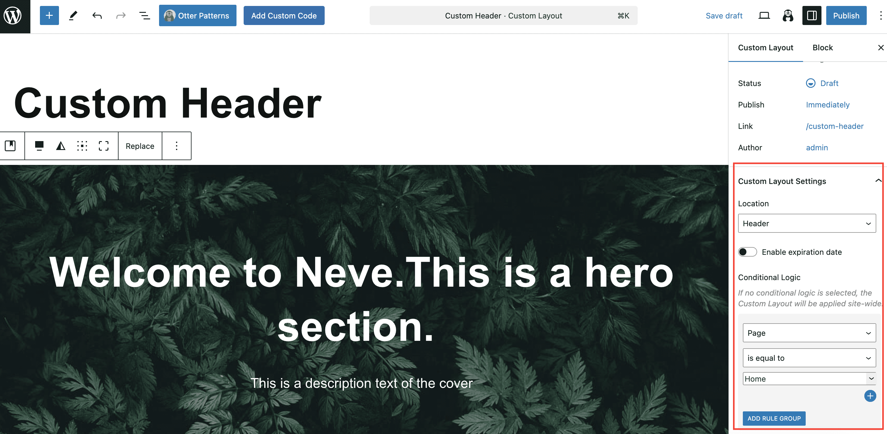 In the Conditional Logic section, you decide the criteria based on which the Custom Layout will be used on a page or not.