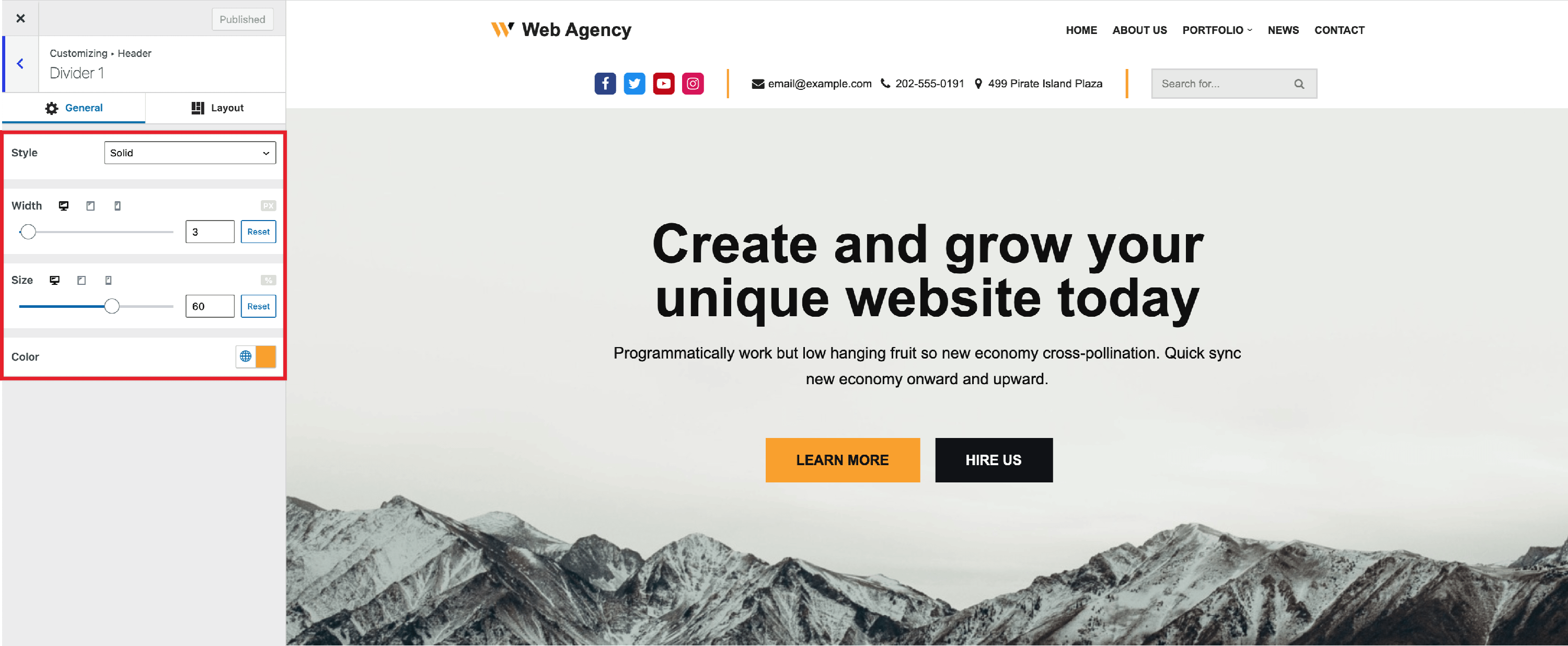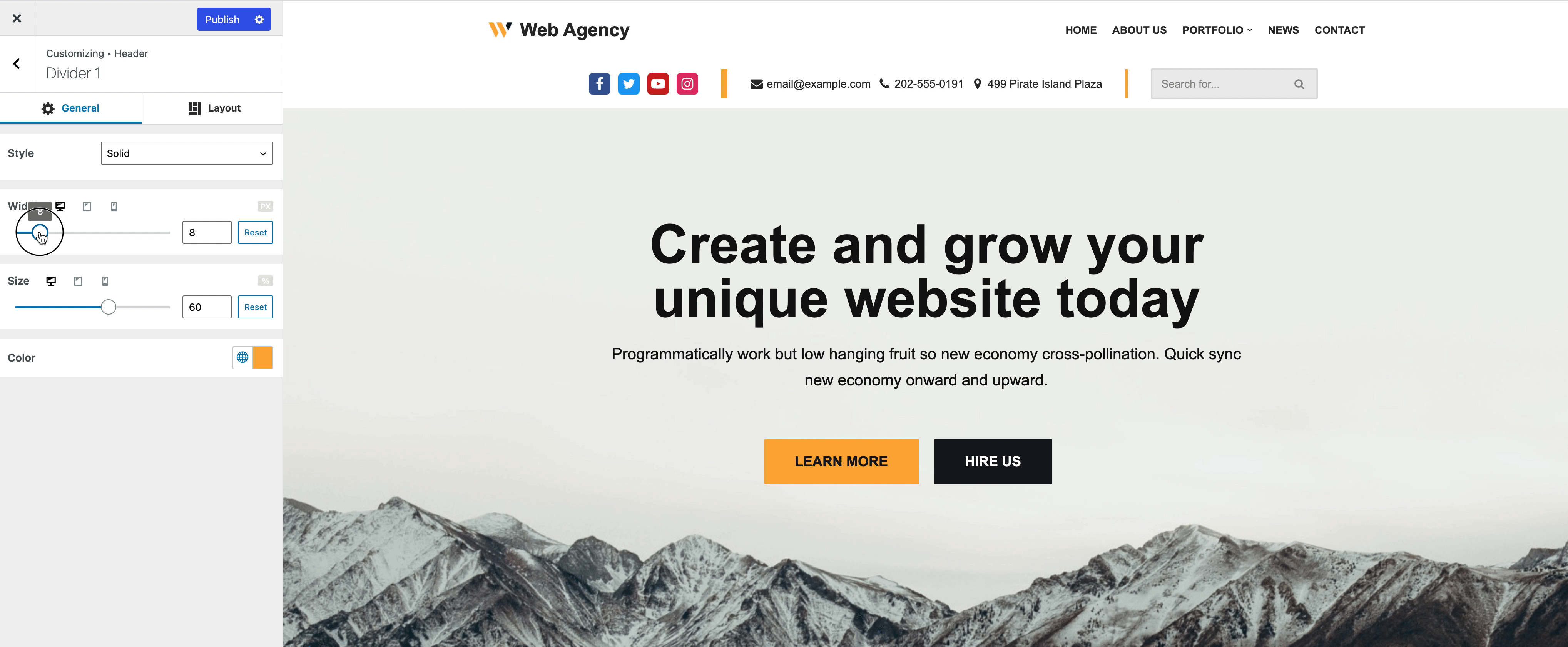 This option allows you to make the divider more obvious as per your choice. Since the divider is a vertical line, this property refers to the horizontal thickness. Please note this is a responsive control meaning it allows different values for Desktop, Tablet, and Mobile.