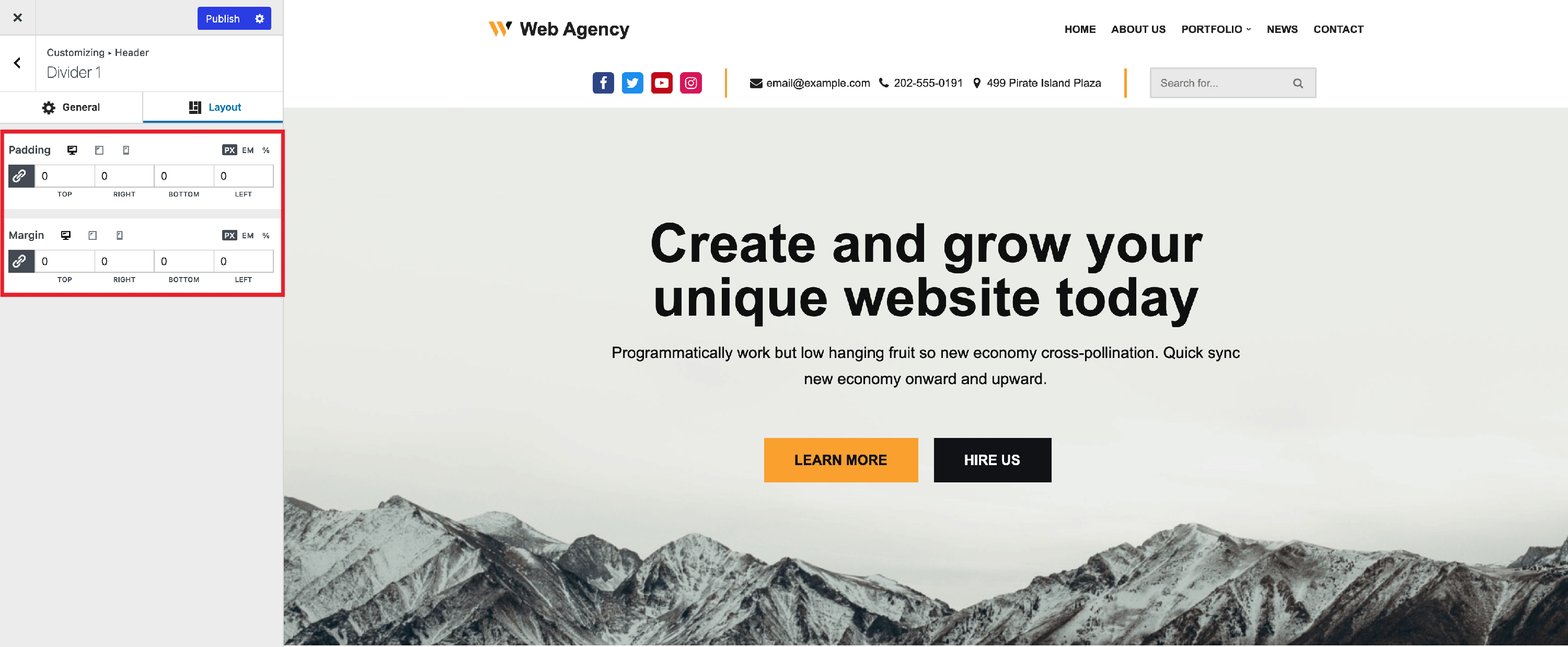 - Padding and Margin - available in PX, EM, REM, and %, with a link button that helps establish the same dimension for all the directions ( Desktop | Tablet | Mobile ).
