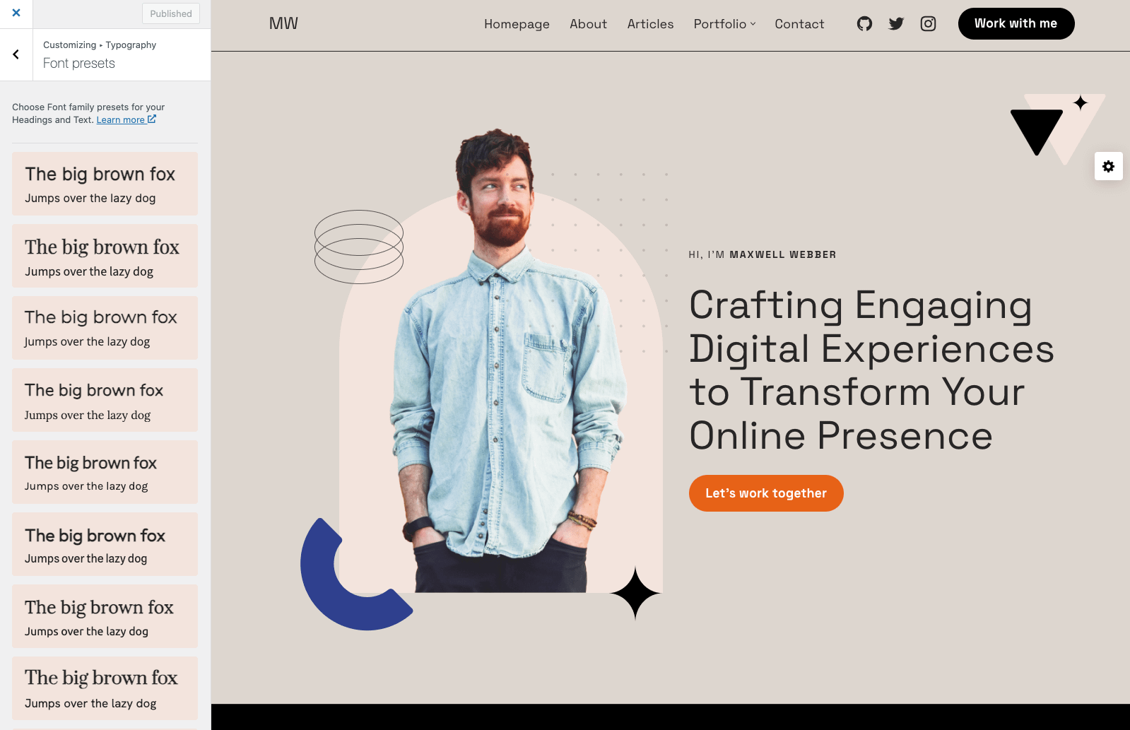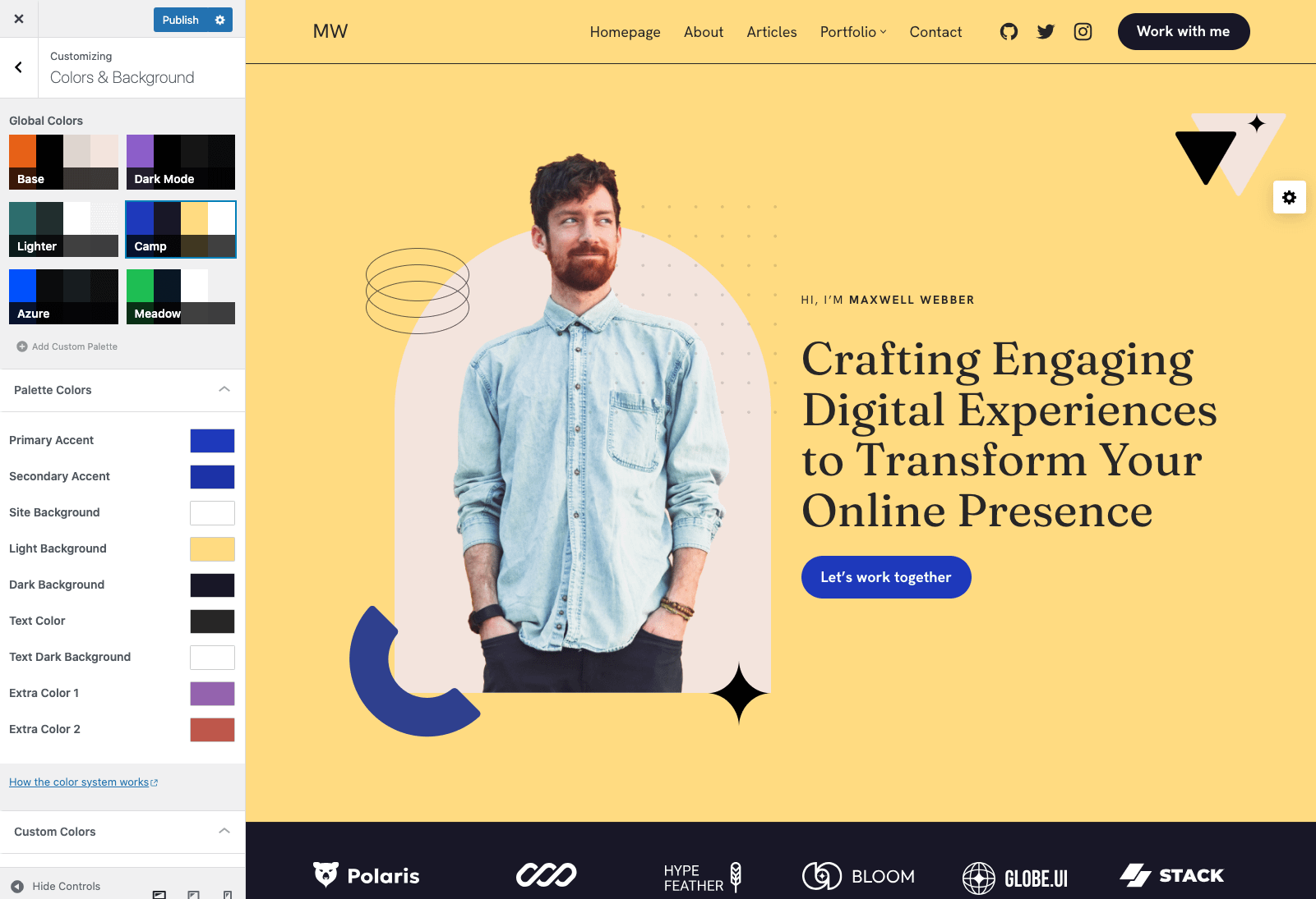 A great way to quickly customize your starter site is through Neve’s Customizer (in Neve > Customize). Try out the different font presets under the “Typography” panel and the different Color Palettes located under “Colors and Background”. These will result in a completely new look and feel within seconds.