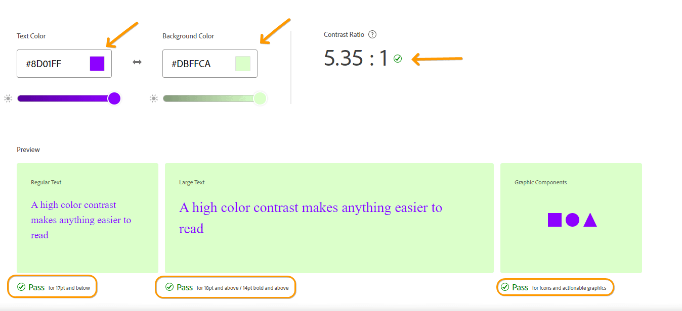 You must add a color for the text and one for the background (left) and see how the contrast works (right). Make sure that every test is passed by checking the message below.