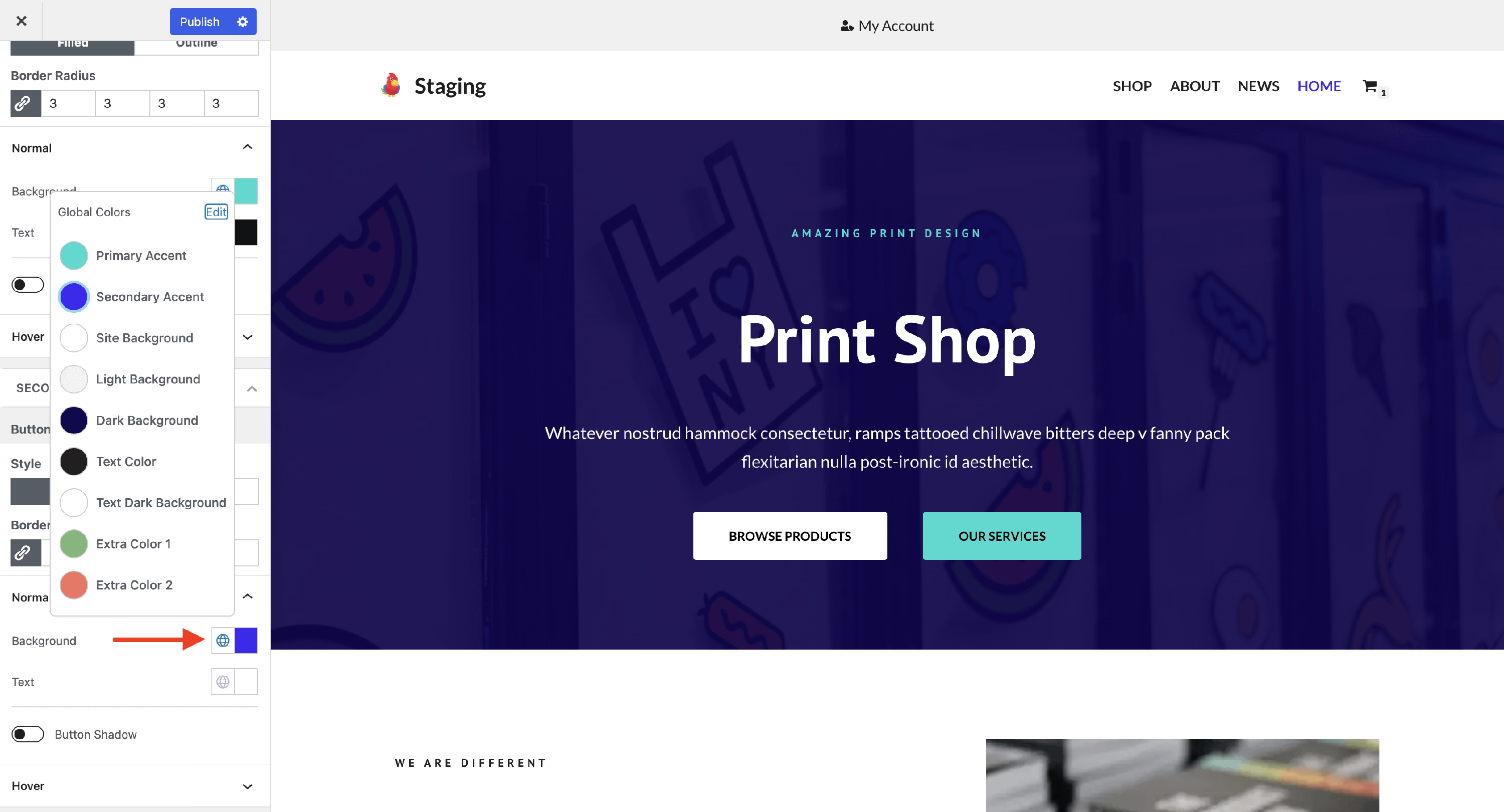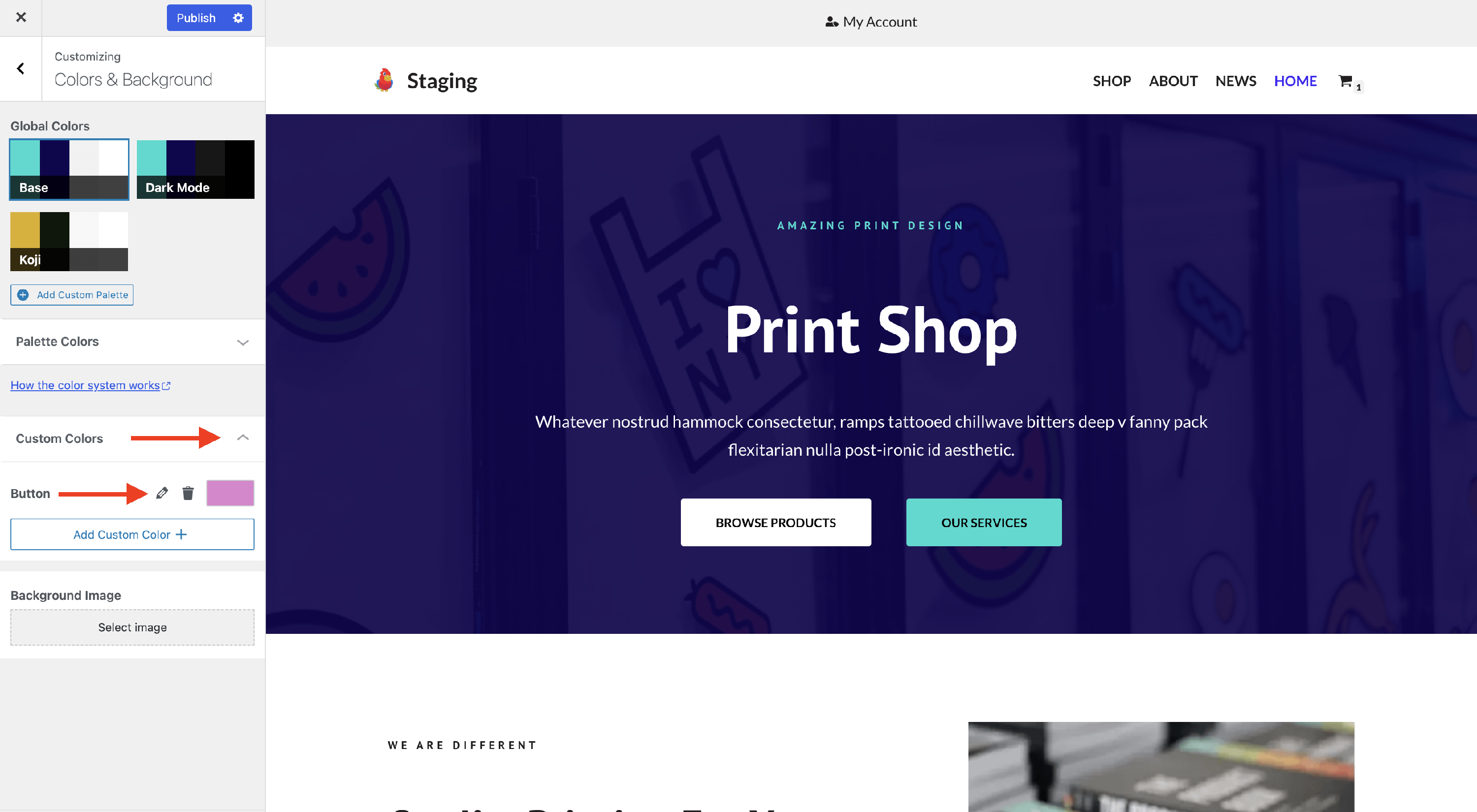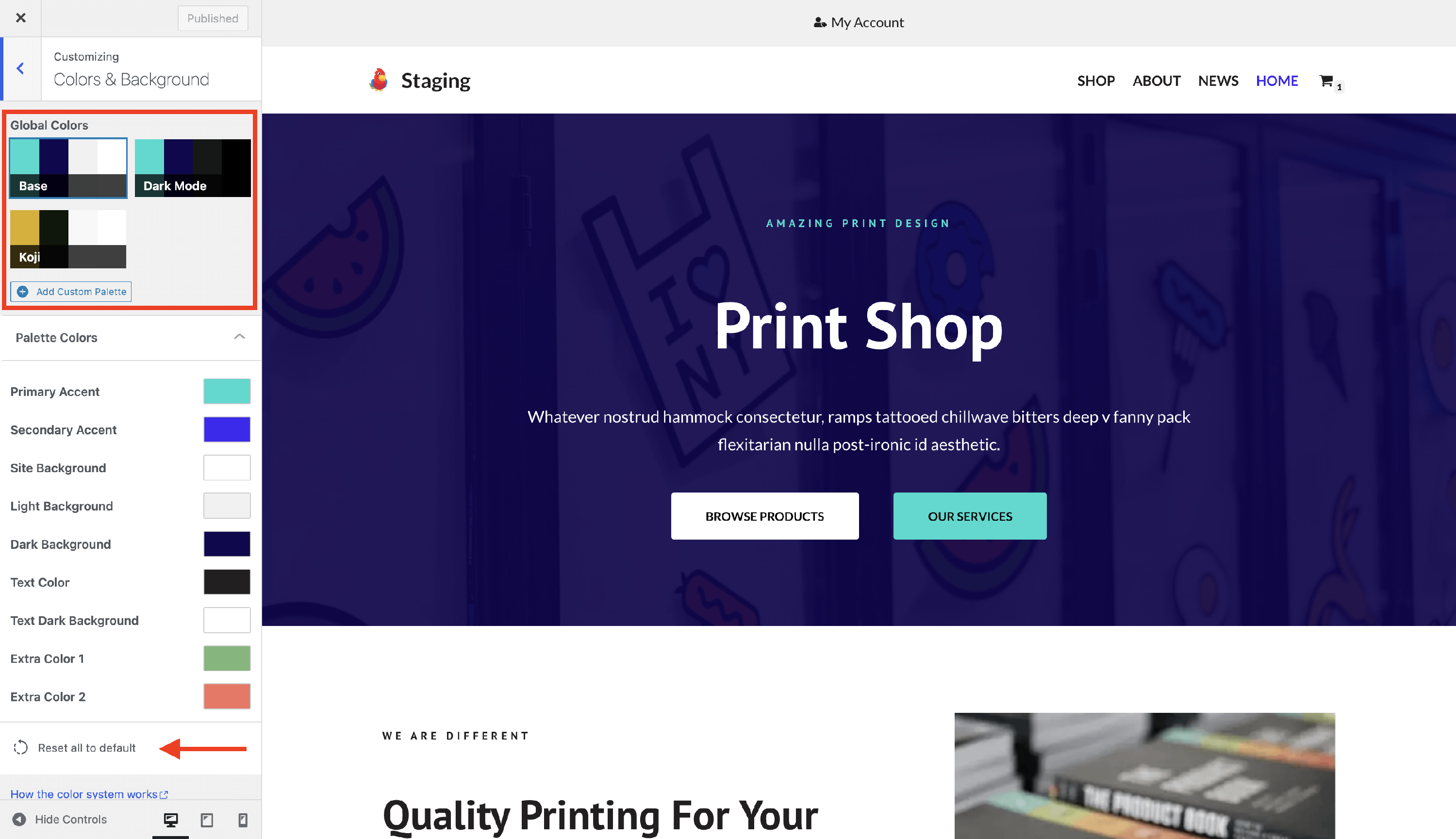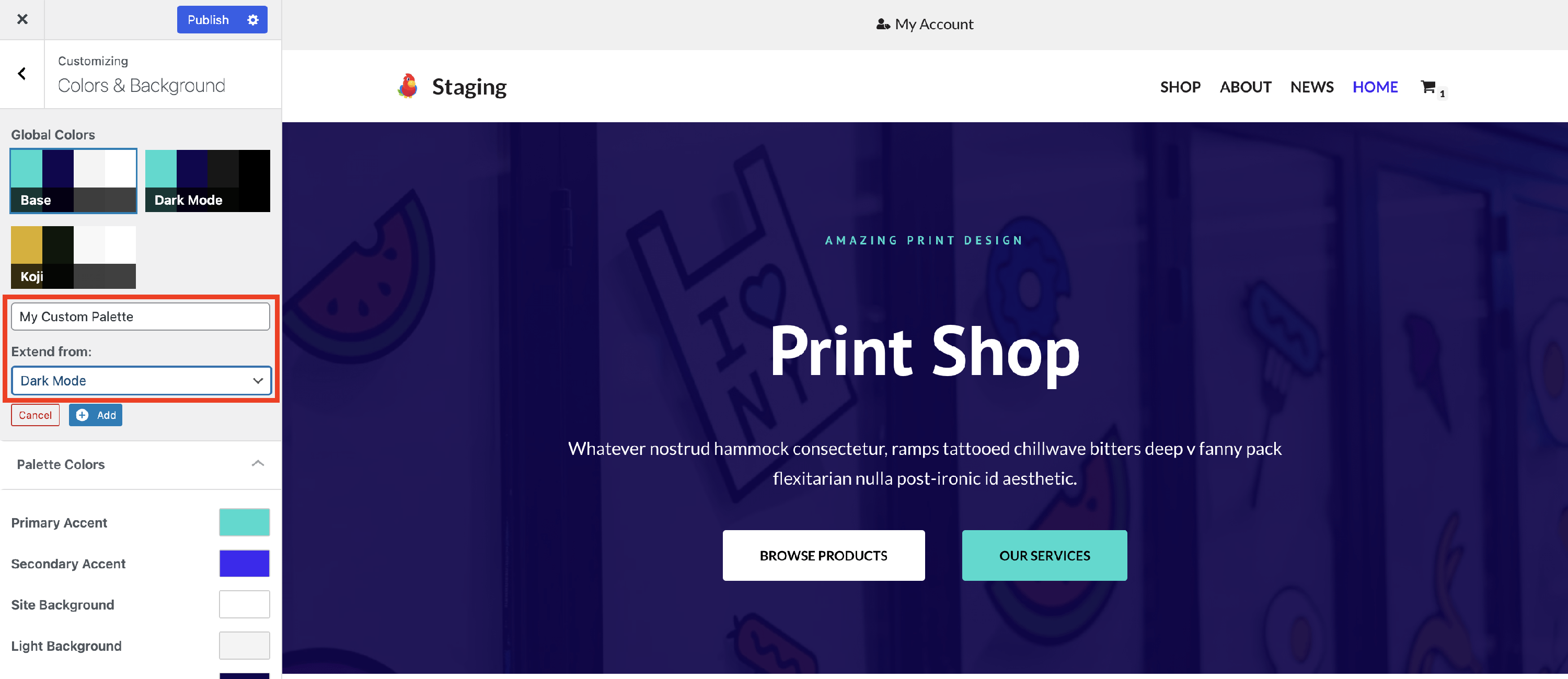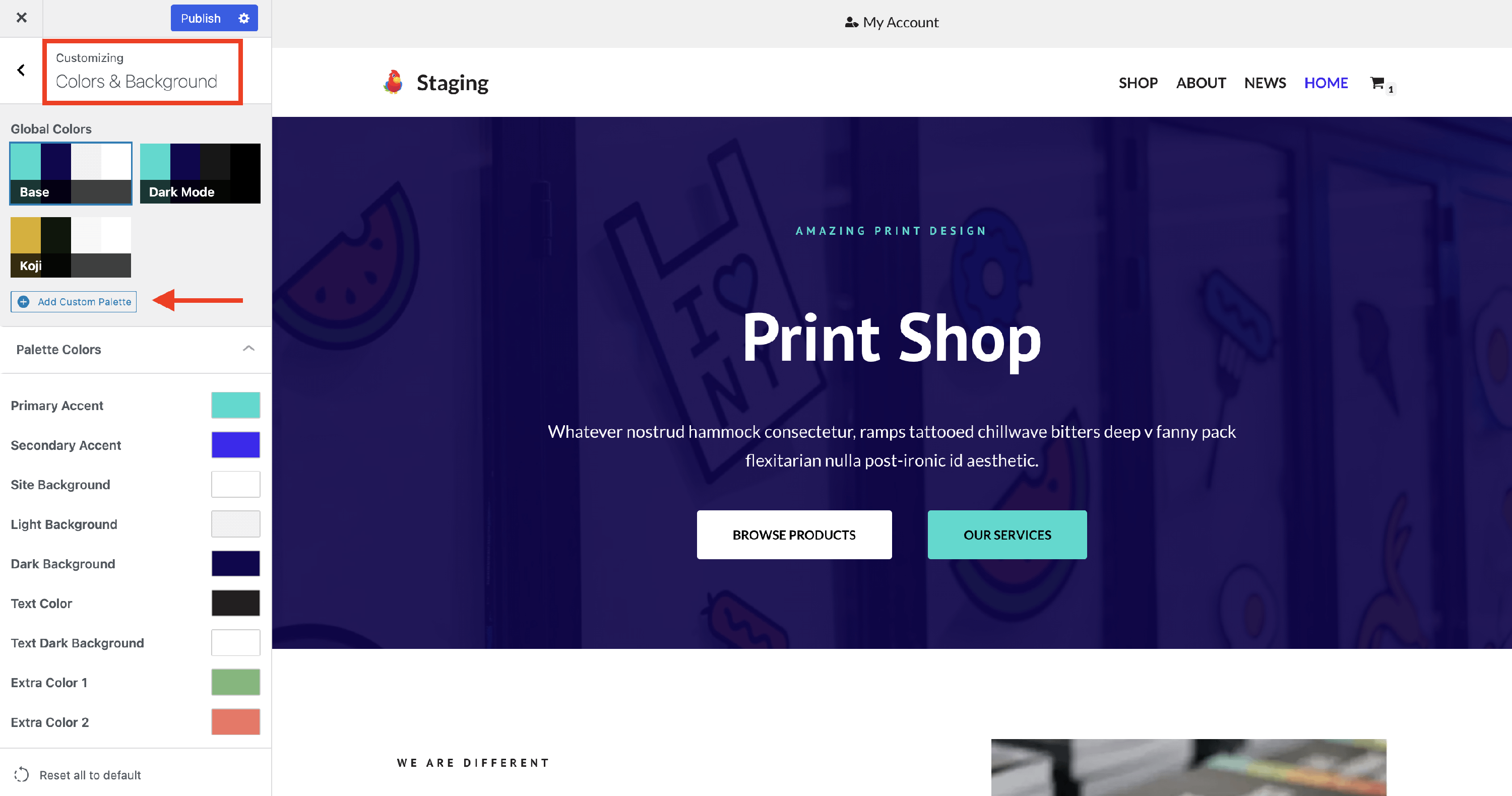 You now have a new color palette that can be customized. Select the color of your choice for each palette option and publish the changes.