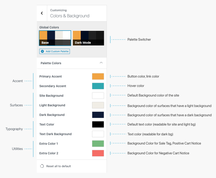 These new colors can be used across your website, in the Customizer, or inside the page editors (Gutenberg, Elementor):