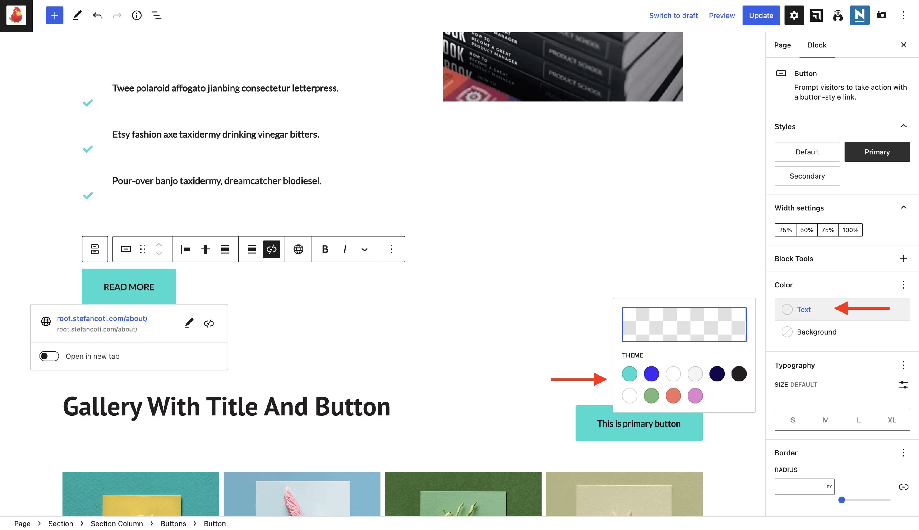 📝 Note: In this example, we've used one of the global colors from the color palette for the Button component. This means that any change done to that color in the color palette will automatically apply to the button, keeping the site look consistent across all pages.