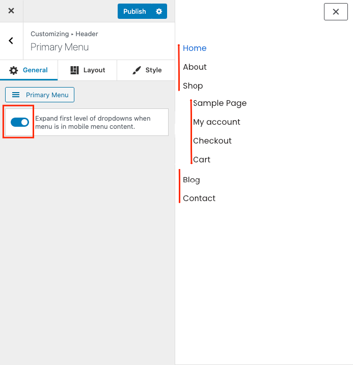 - expand the first level of the dropdowns when the menu is in the mobile menu content - enable / disable.