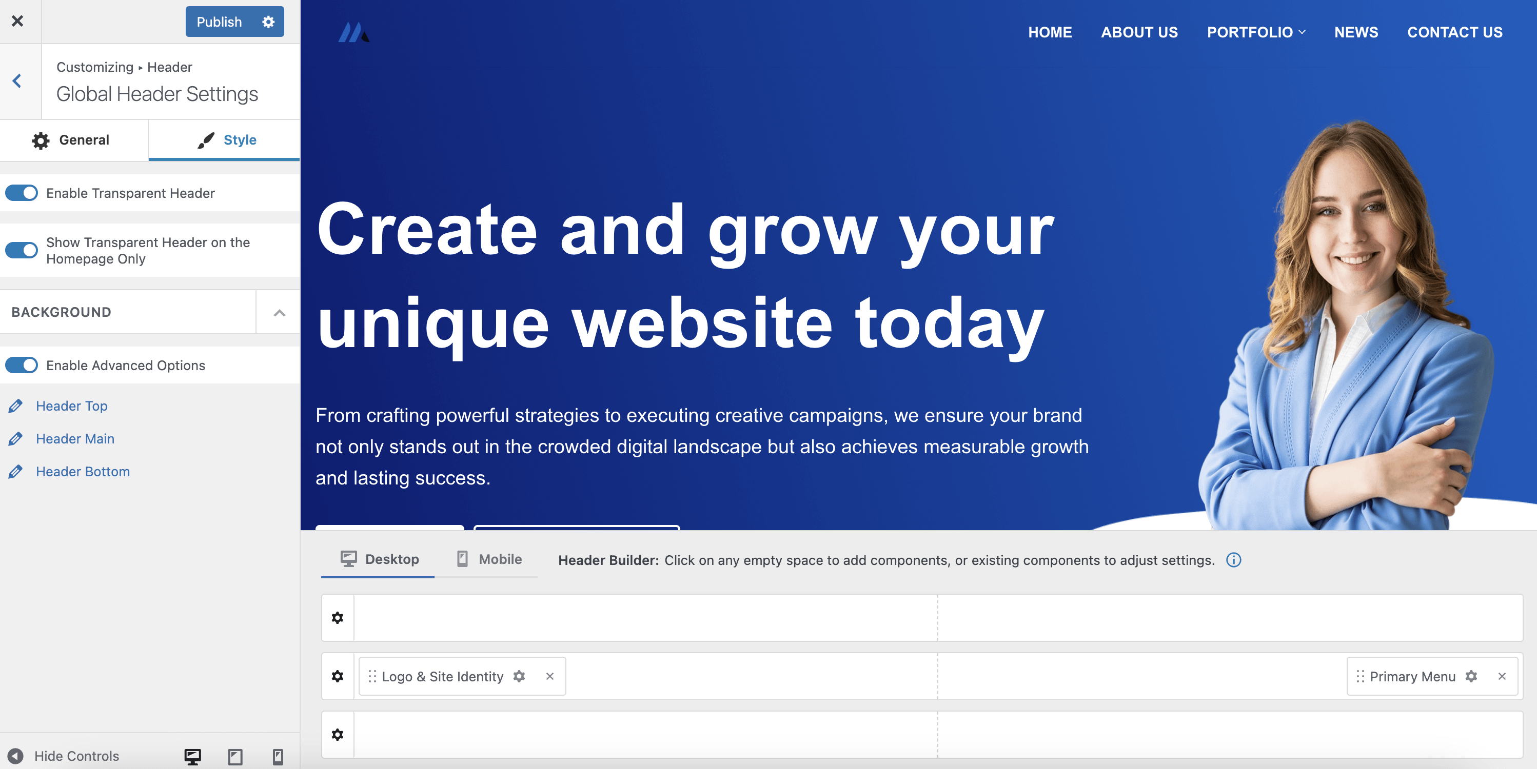 A transparent header allows you to easily create beautiful headers. Enabling this option will set your header background to transparent and pull the page content to the top.