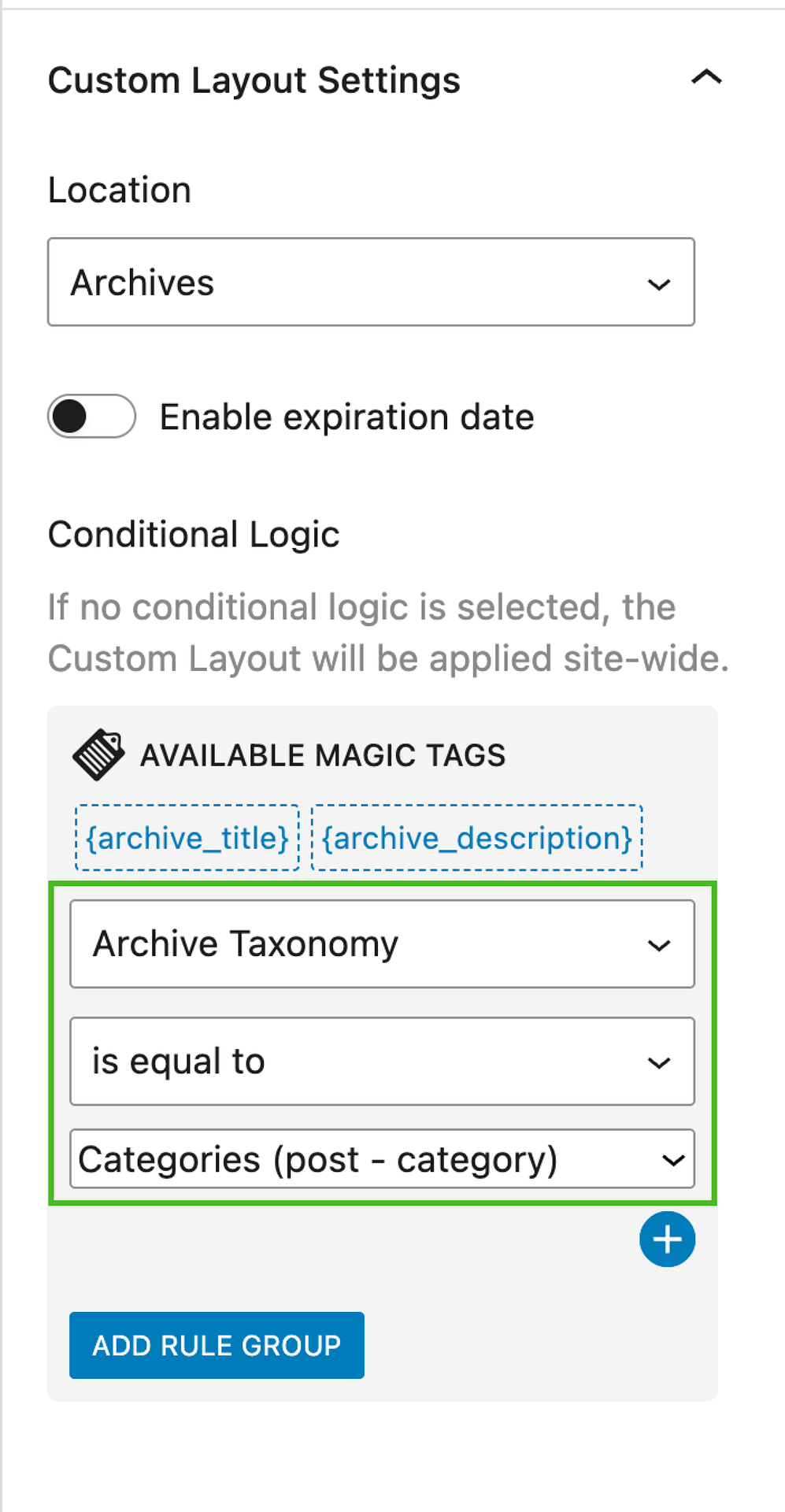 📝 Note: If no conditional logic is set, the layout will apply to all archive pages on the site.