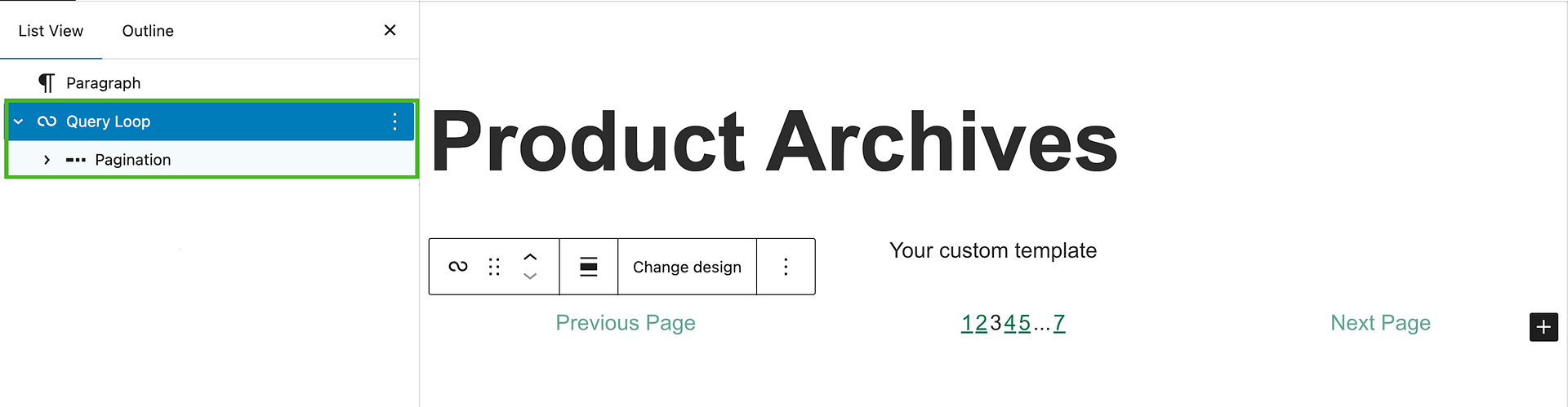 The Query Loop block is what makes your custom archive layout dynamic — it automatically fetches posts that belong to the current category. Pagination only works when it is a direct child of this block.