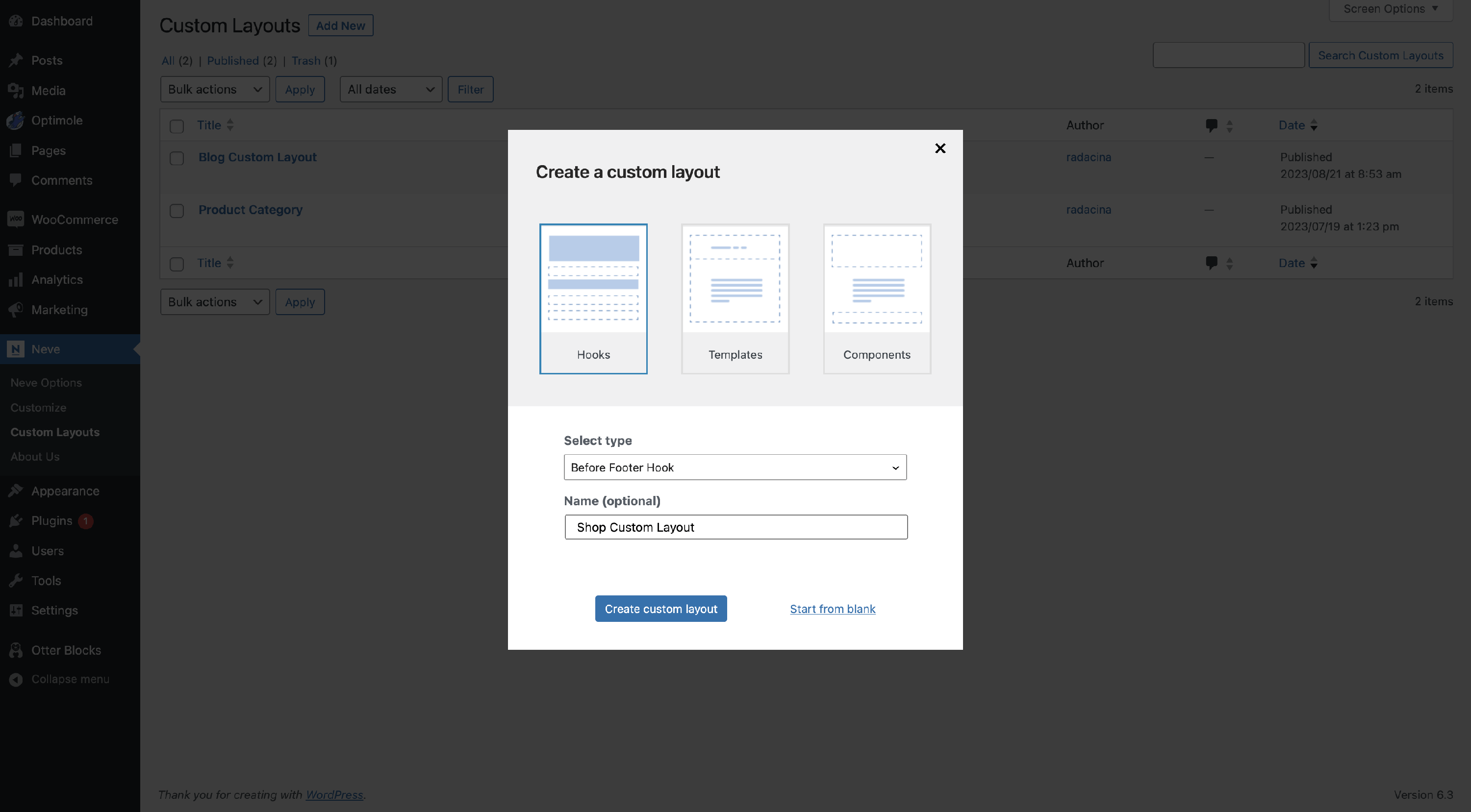 1 To manage the layouts, navigate to Neve > Custom Layouts.