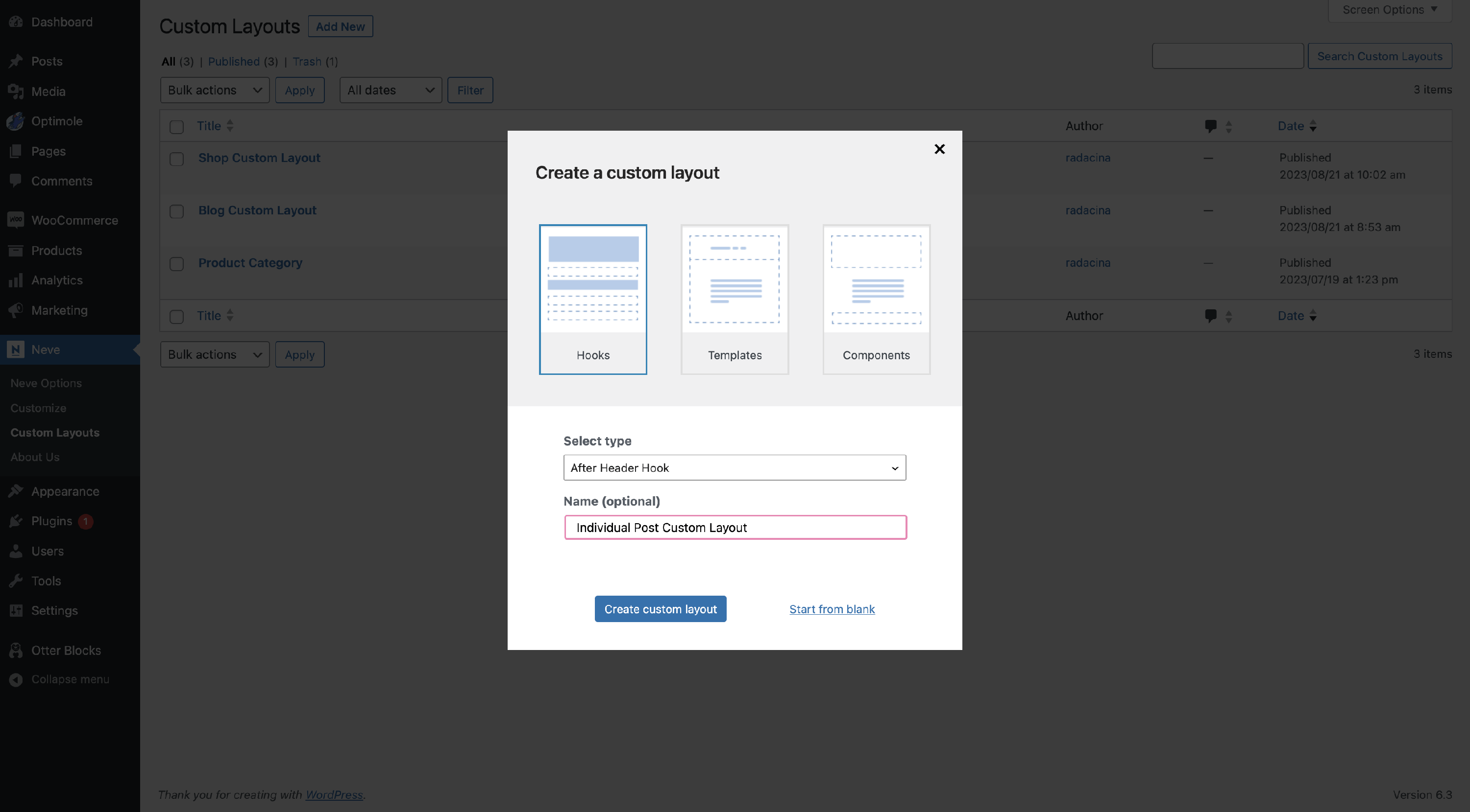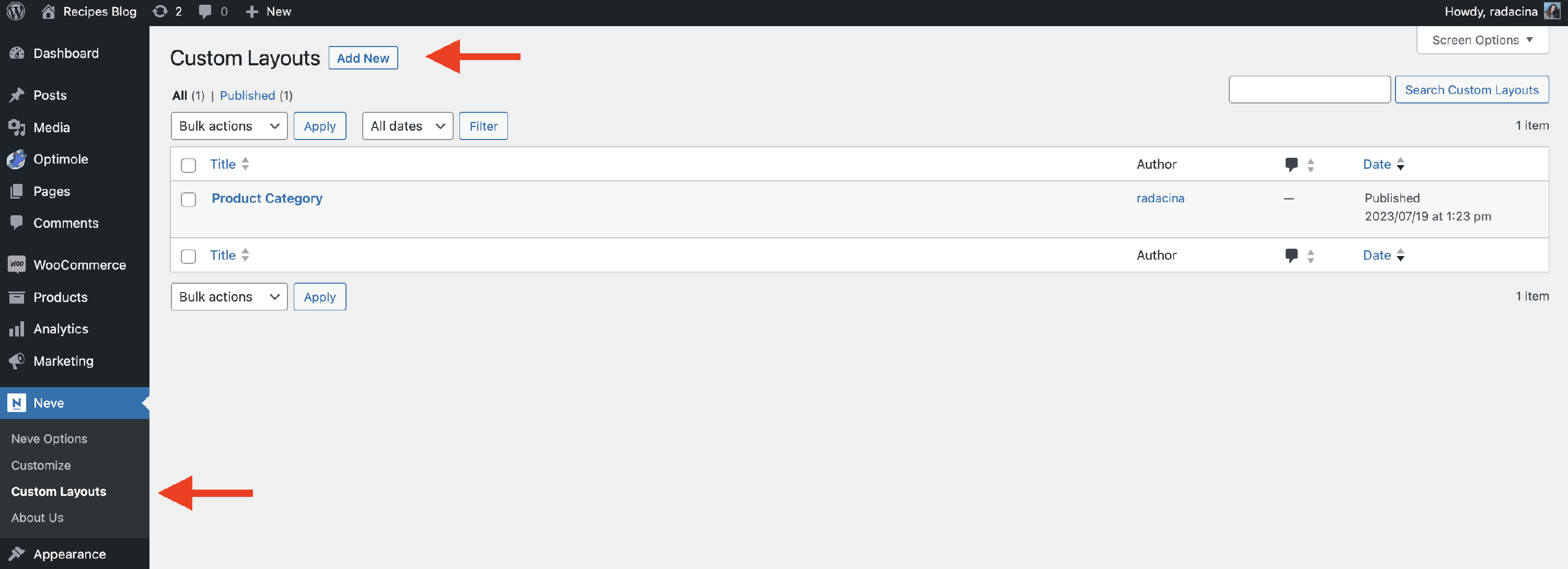 1 To manage the layouts, navigate to Neve > Custom Layouts.