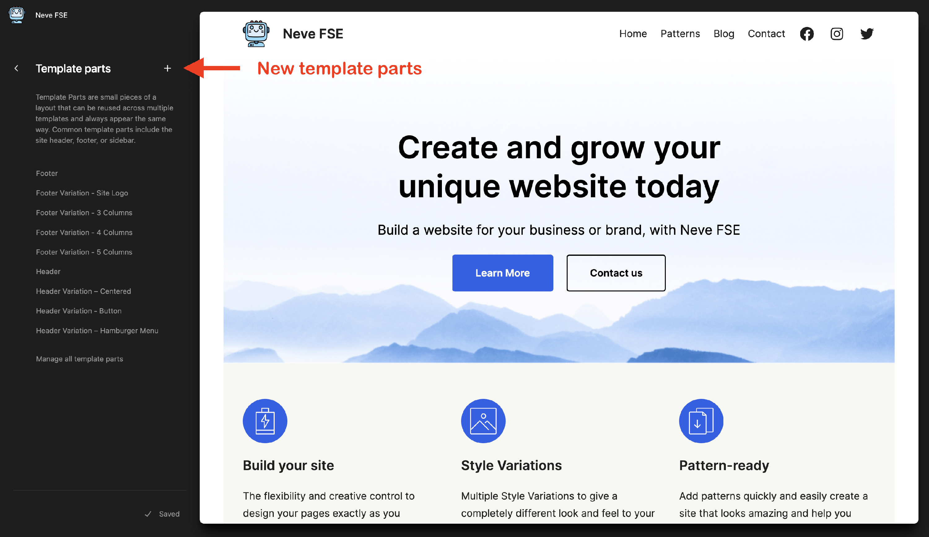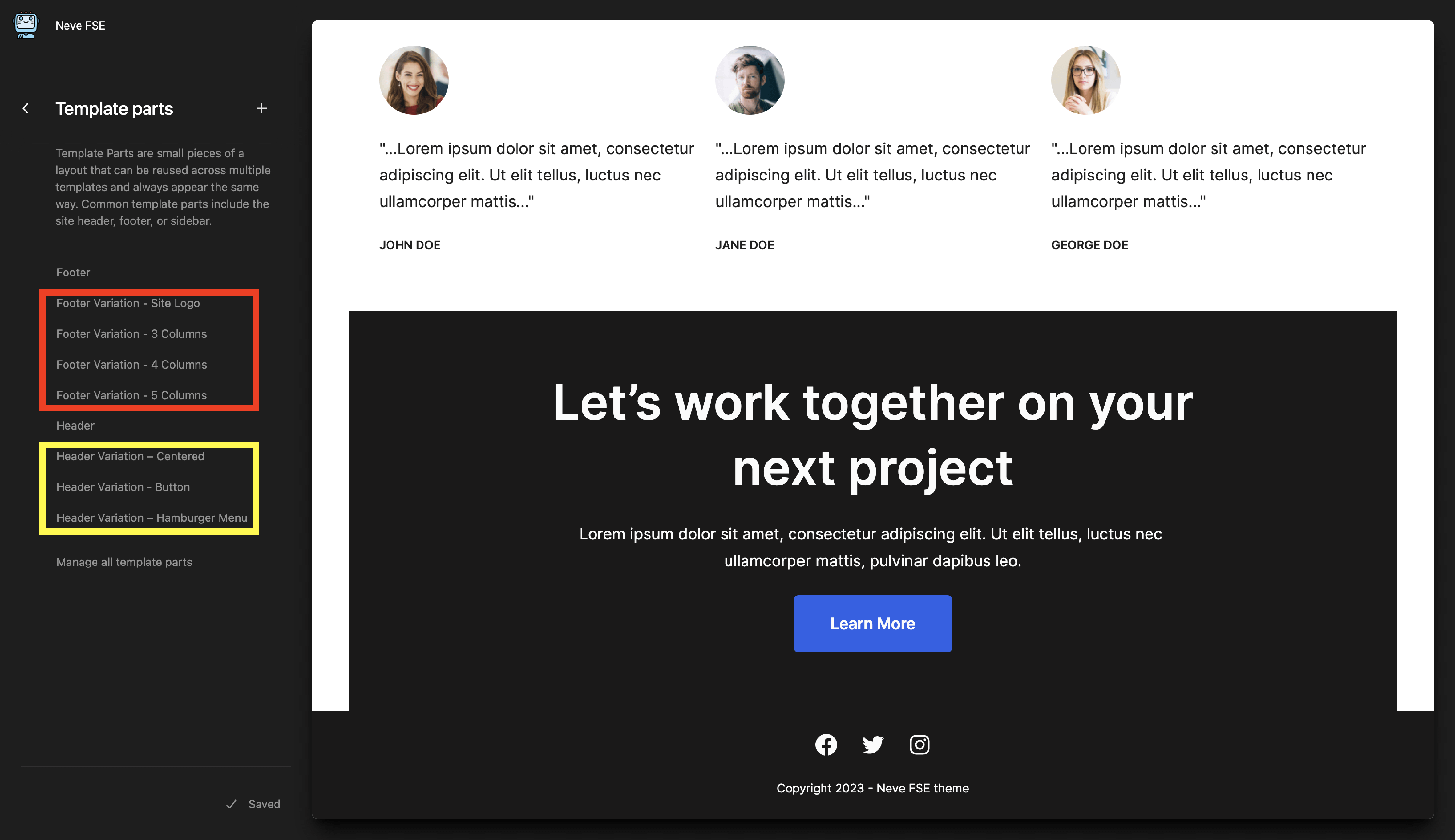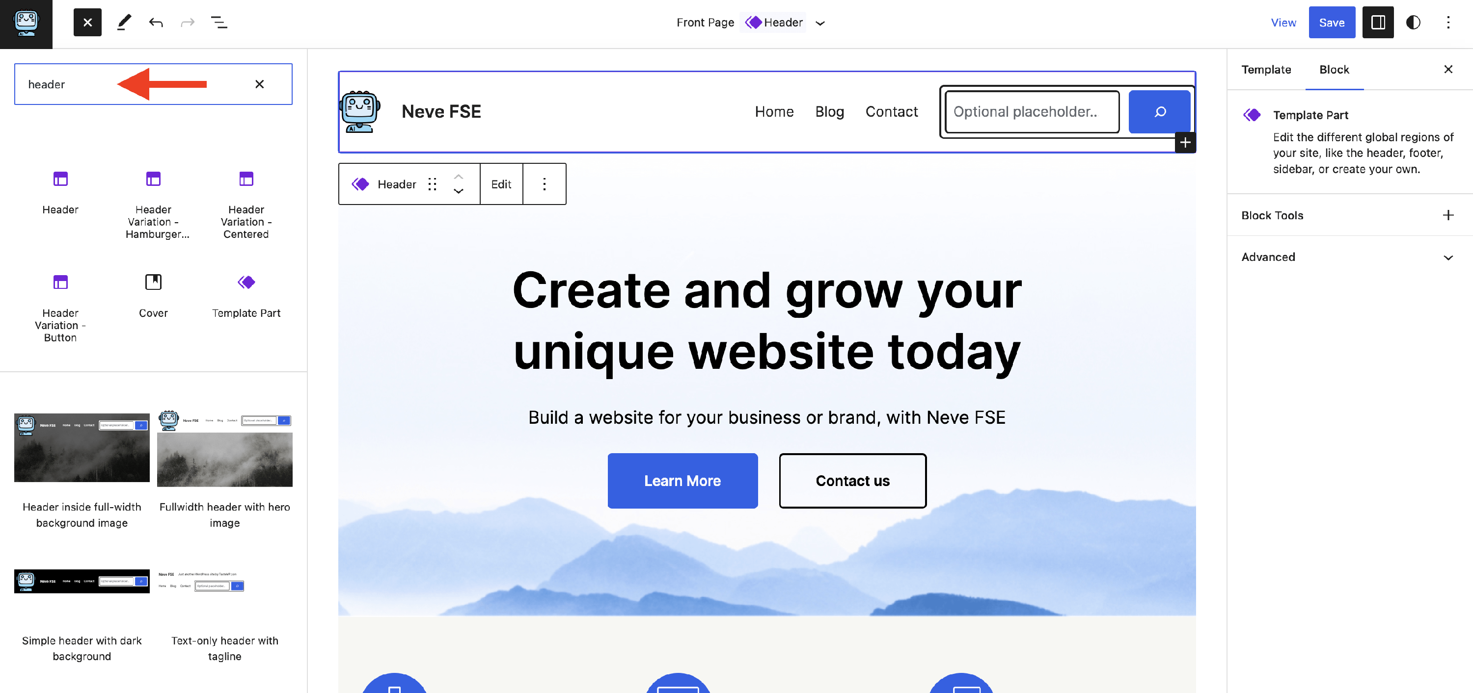 Neve FSE Theme comes with a very powerful feature that will help previous Neve users improve their experience with the block-based editor. Apart from the possibility of creating a header and footer, Neve FSE also provides variations of each template part.