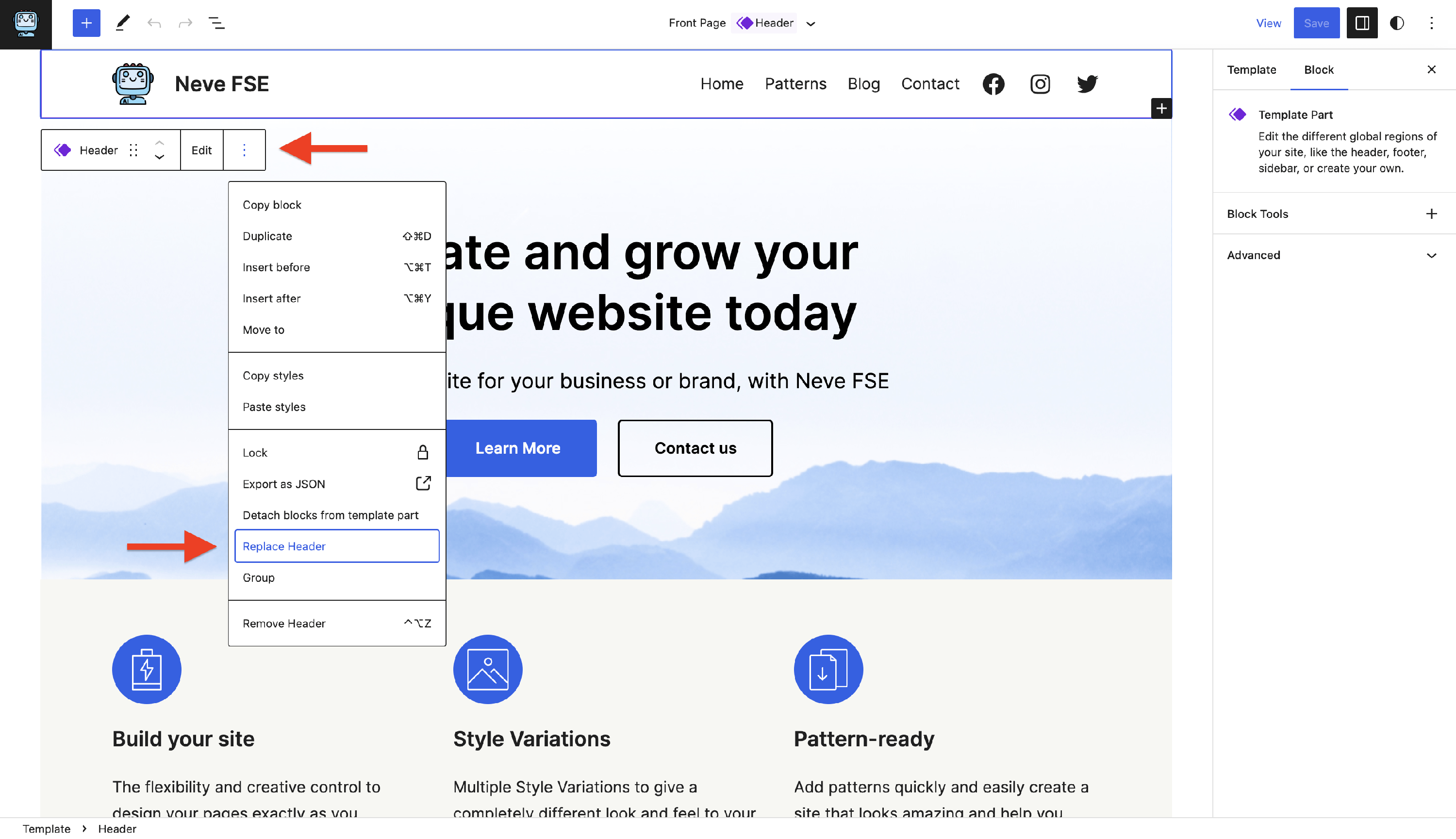 3 Select Replace {template_parts_name} (e.g. Replace Header).