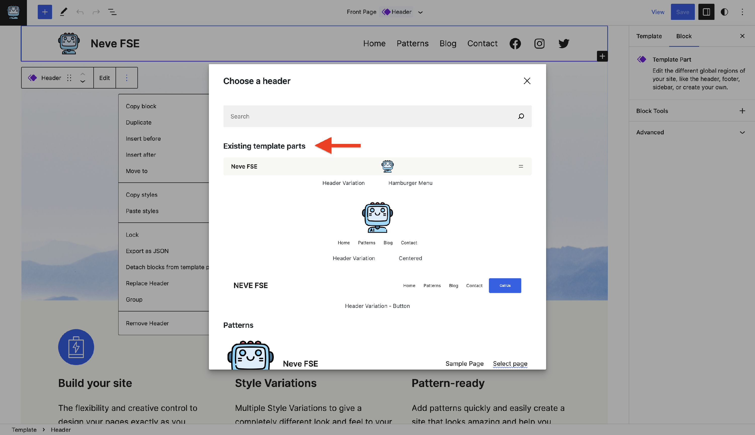 To use the previously created template parts, navigate to one of the templates, for example, Front Page.