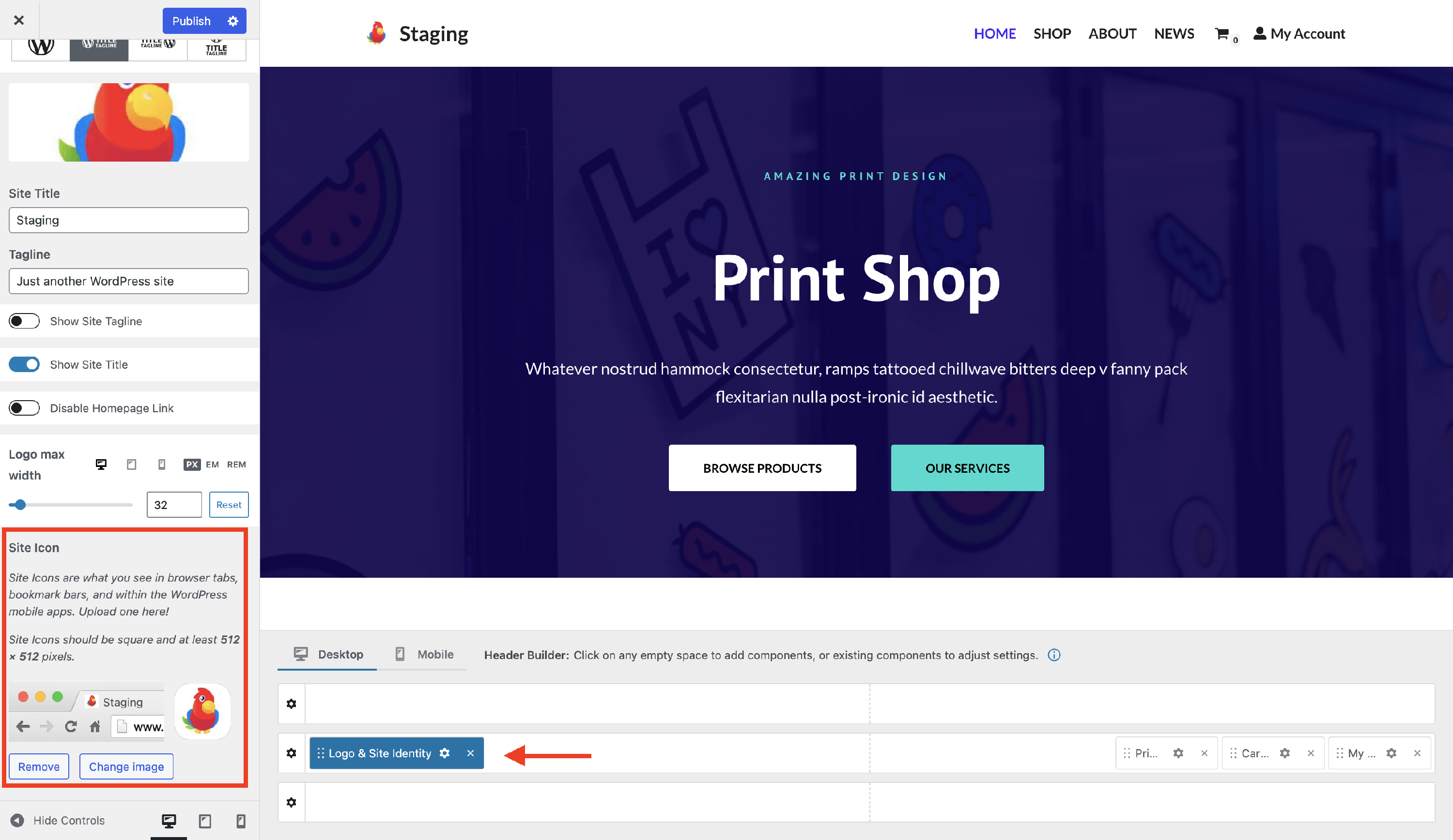 3 Inside the header rows, click on the Logo & Site Identity wheel to open the settings.