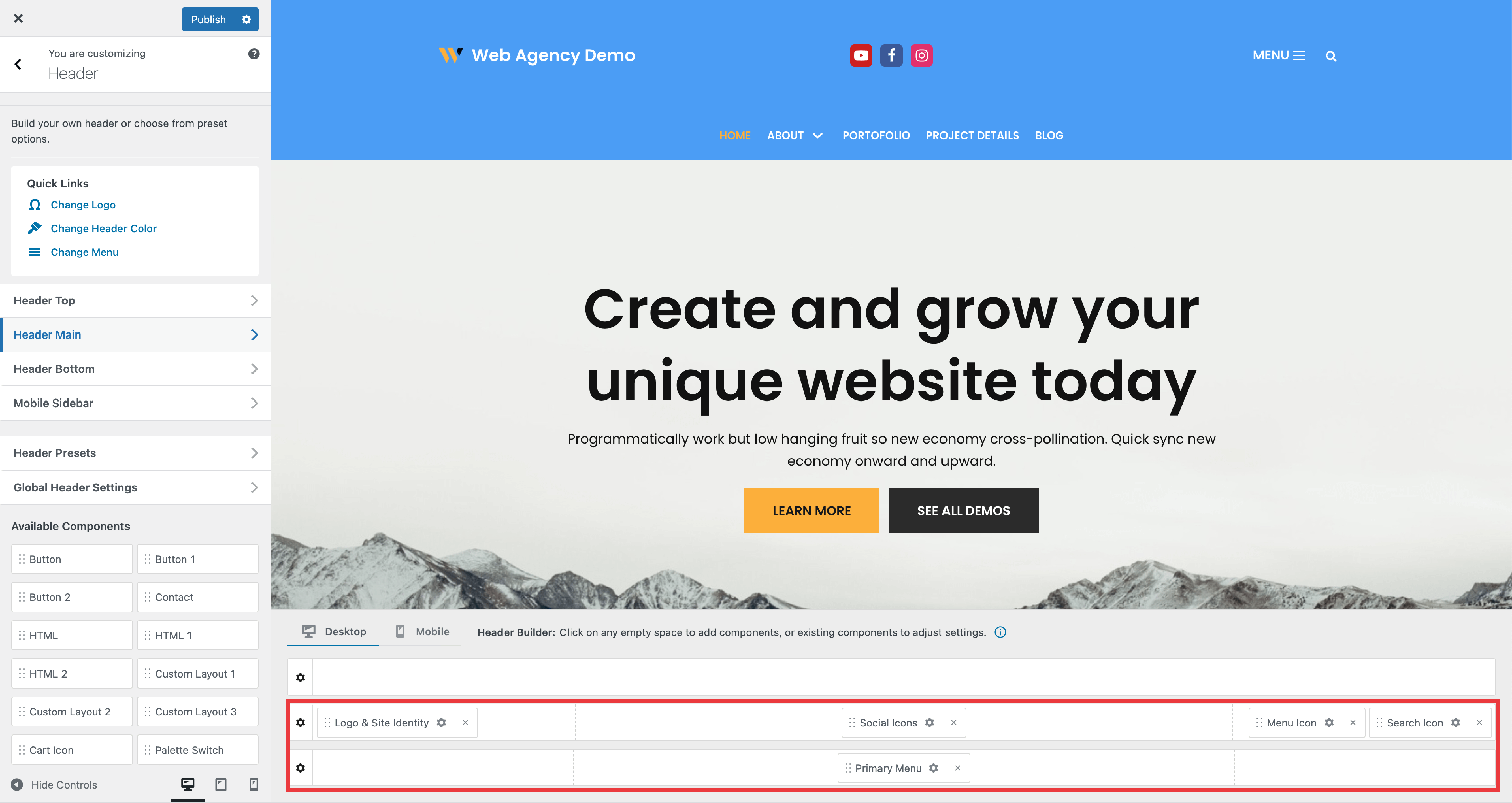 1. Build your header using Neve's header builder. For this example, we've used different components on each row. The idea is that the first row is more complex, and the second one will show only the navigation menu.