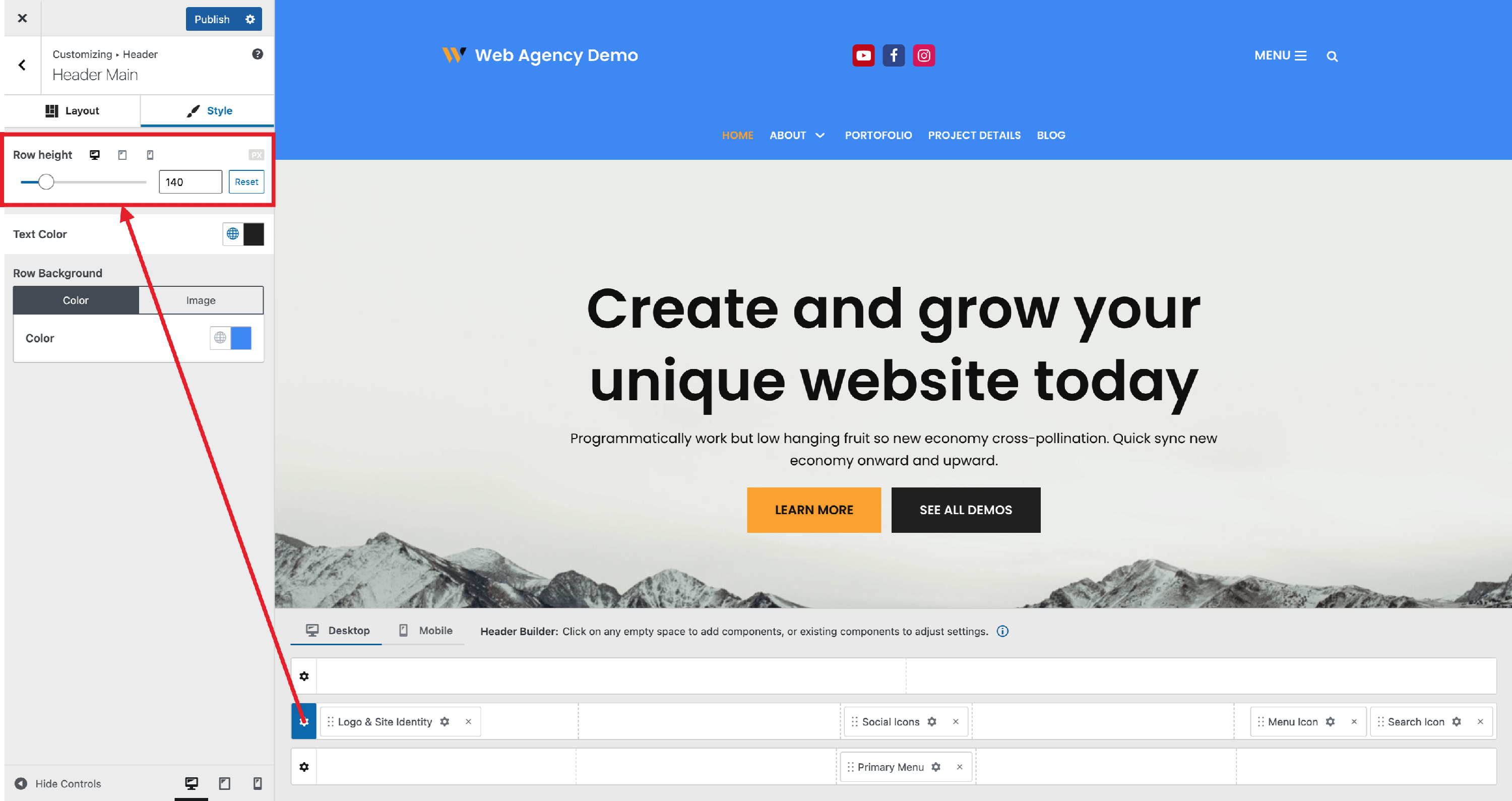 3. Like before, open the header's second row's settings by clicking on the little wheel that appears once you hover with your mouse over the row.