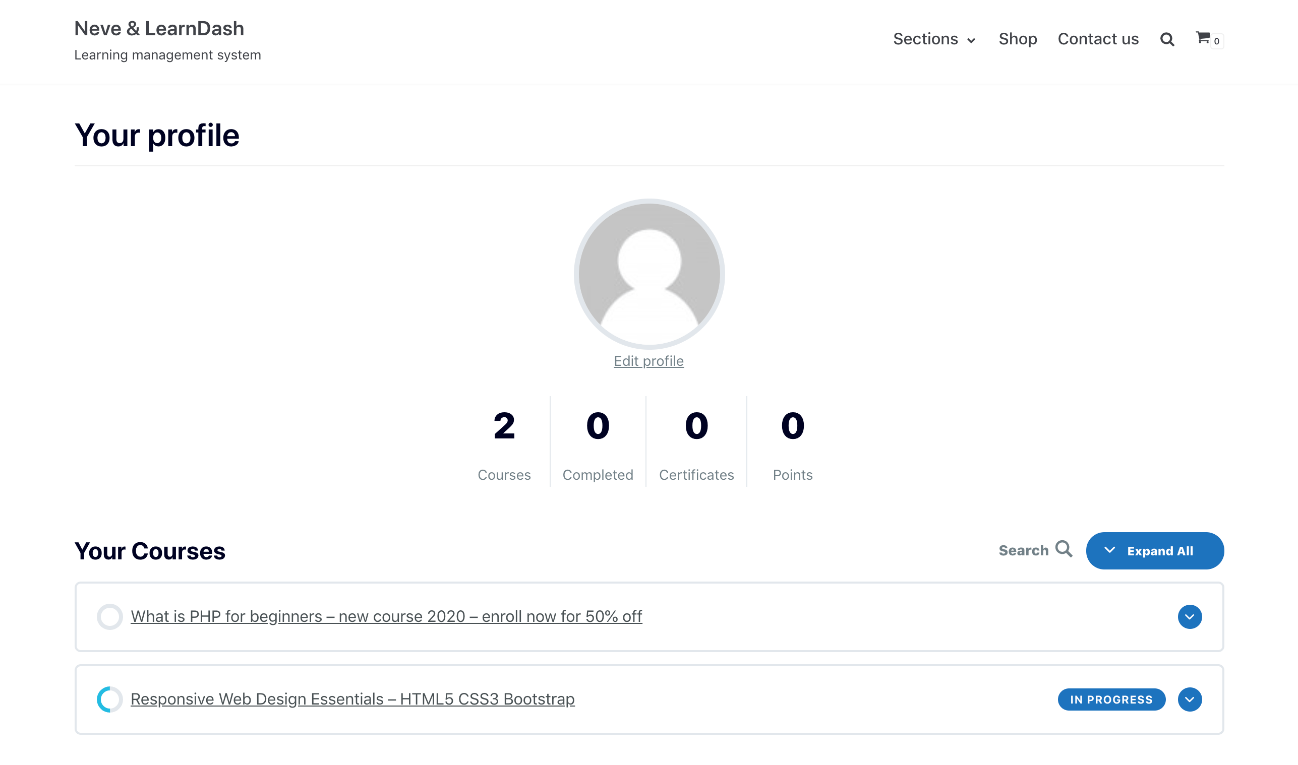 Using the LearnDash Profile custom block offered by LearnDash you can also create a great looking Profile page in Neve.