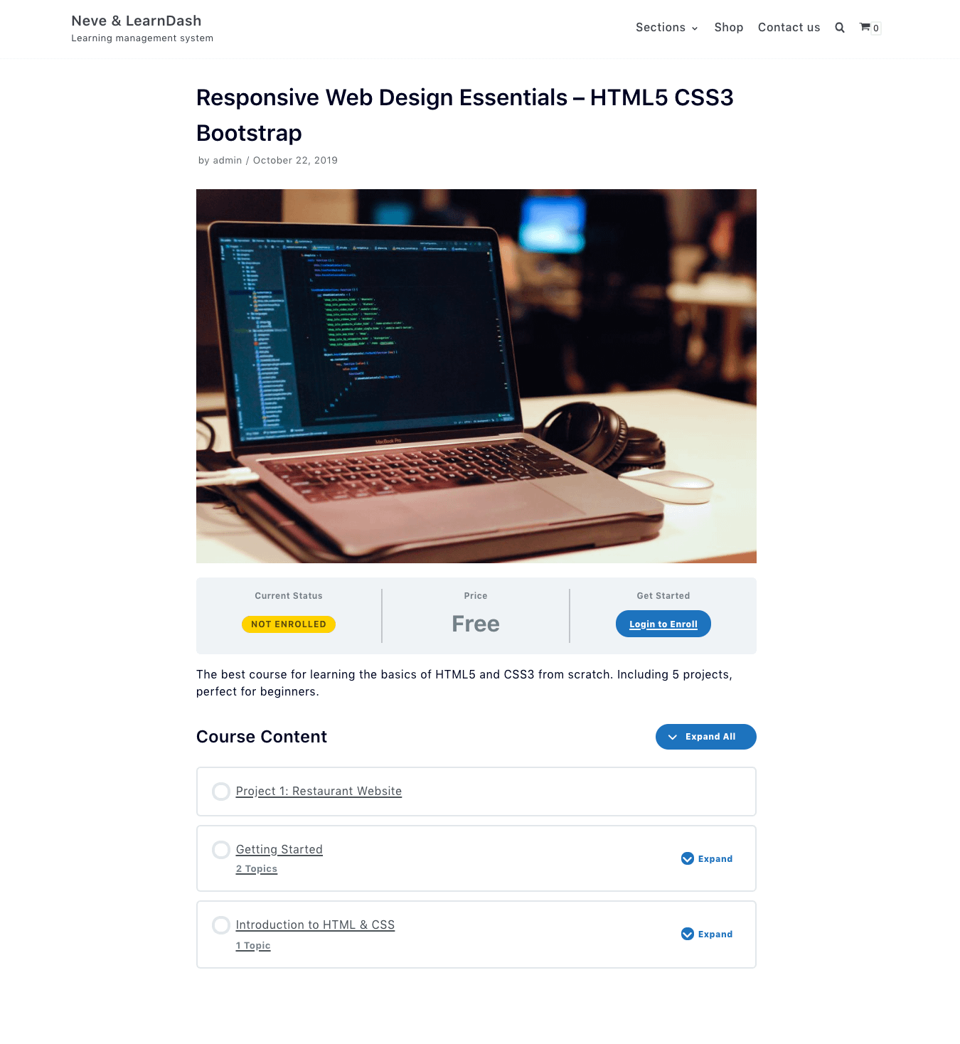 Neve works well with all of LearnDash's options, from Colors to most advanced options like Access Mode for courses. In the screenshot below we have a Free course that needs registration and enrollment.