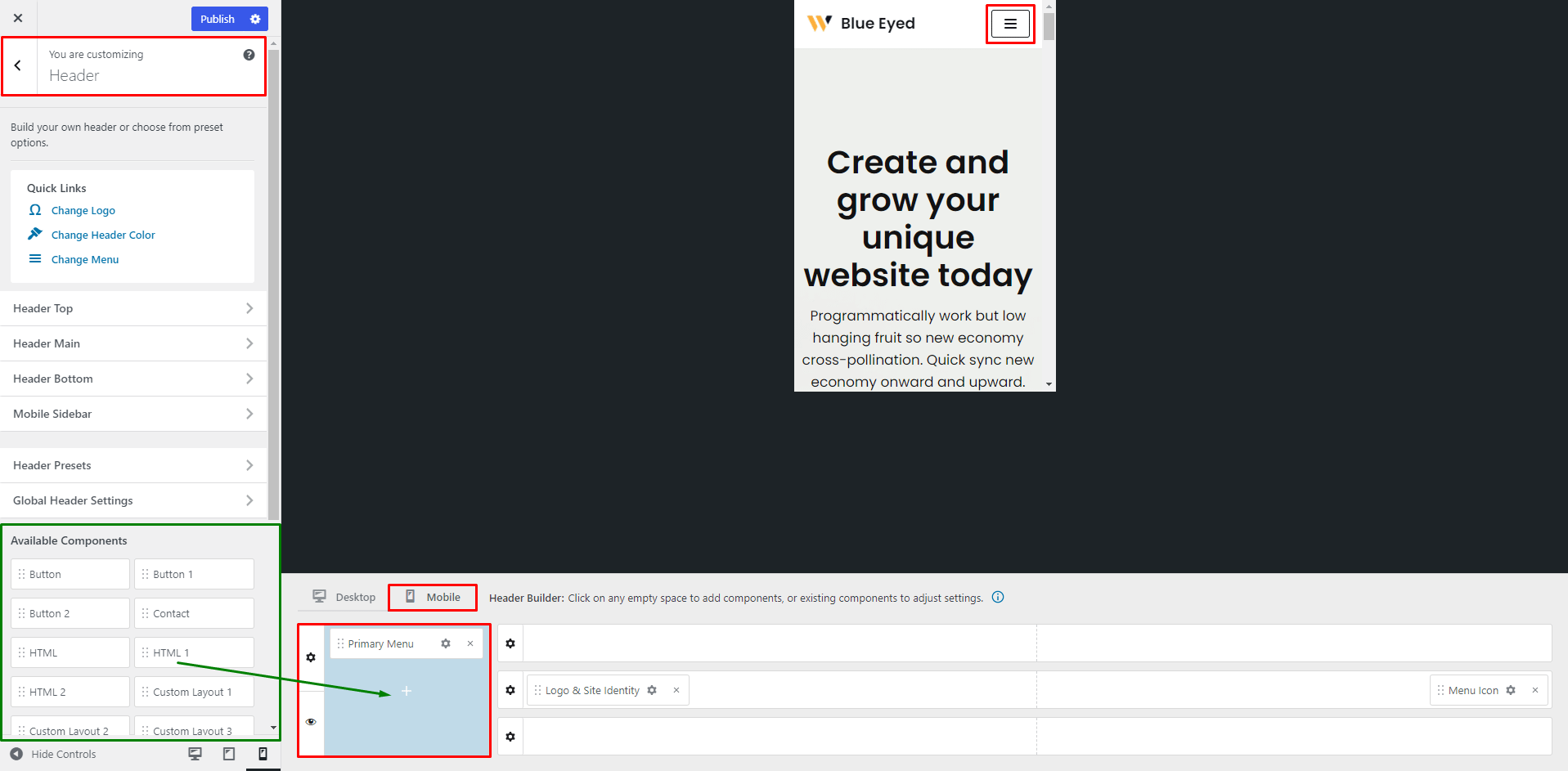 To access the Mobile menu content, click on the Mobile icon on top of the header builder. That will open the mobile header builder, where you can create a different header builder for mobile devices.