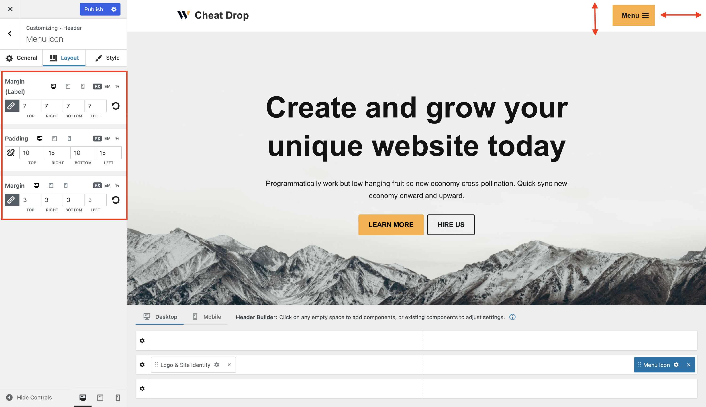 • Padding and Margin - help set up the best position of the Menu Icon component, available in PX, EM, REM, and %, with a link button that helps establish the same dimension for all the directions  ( Desktop | Tablet | Mobile ).