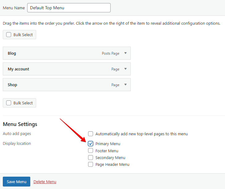 - Open the menu you want to use on mobile and confirm it is assigned to the Primary Menu. Click Save Menu.
